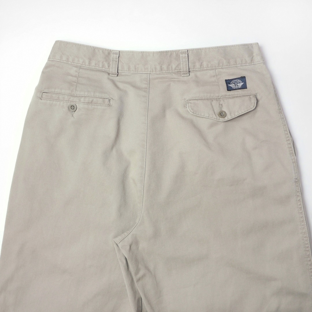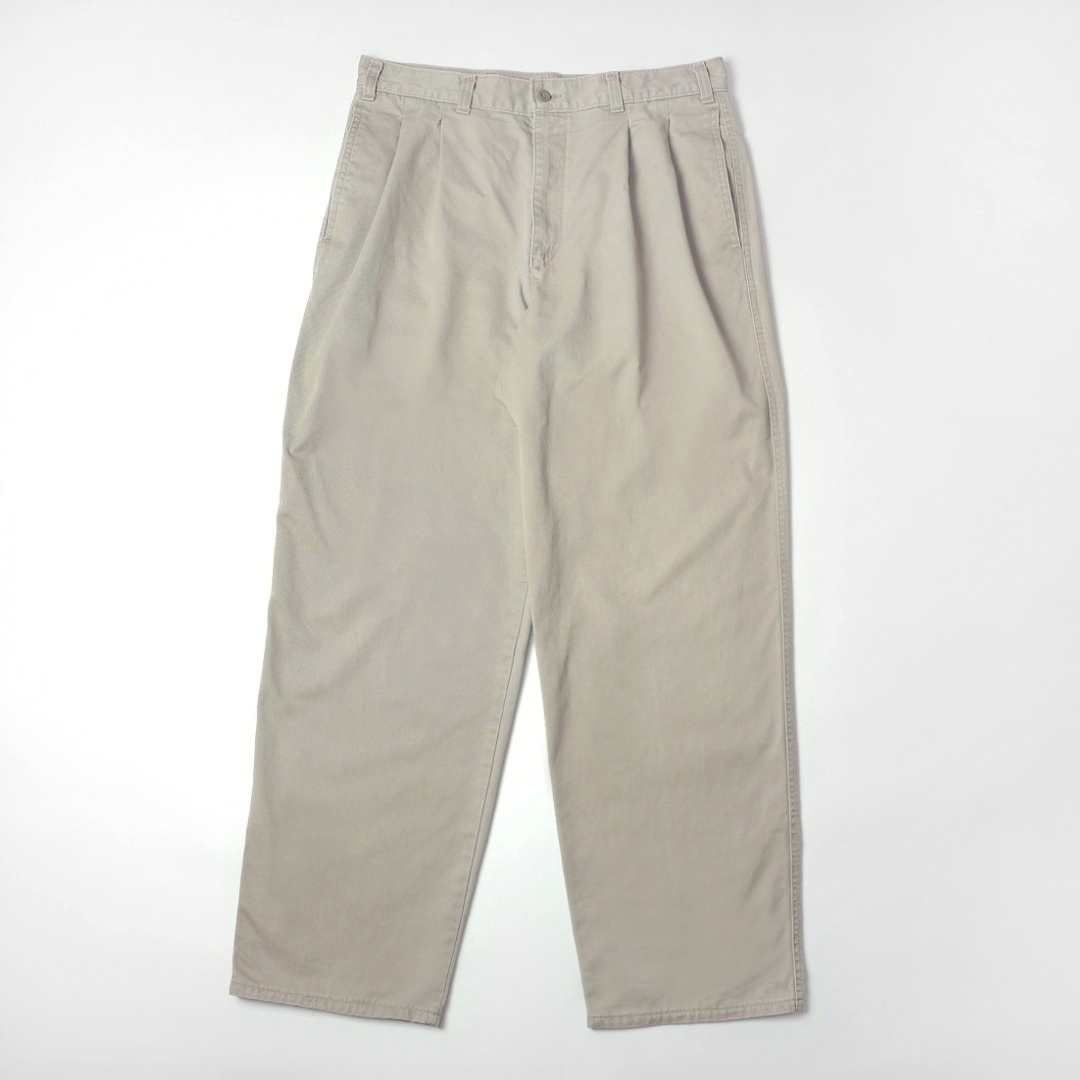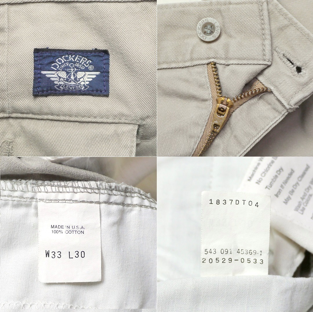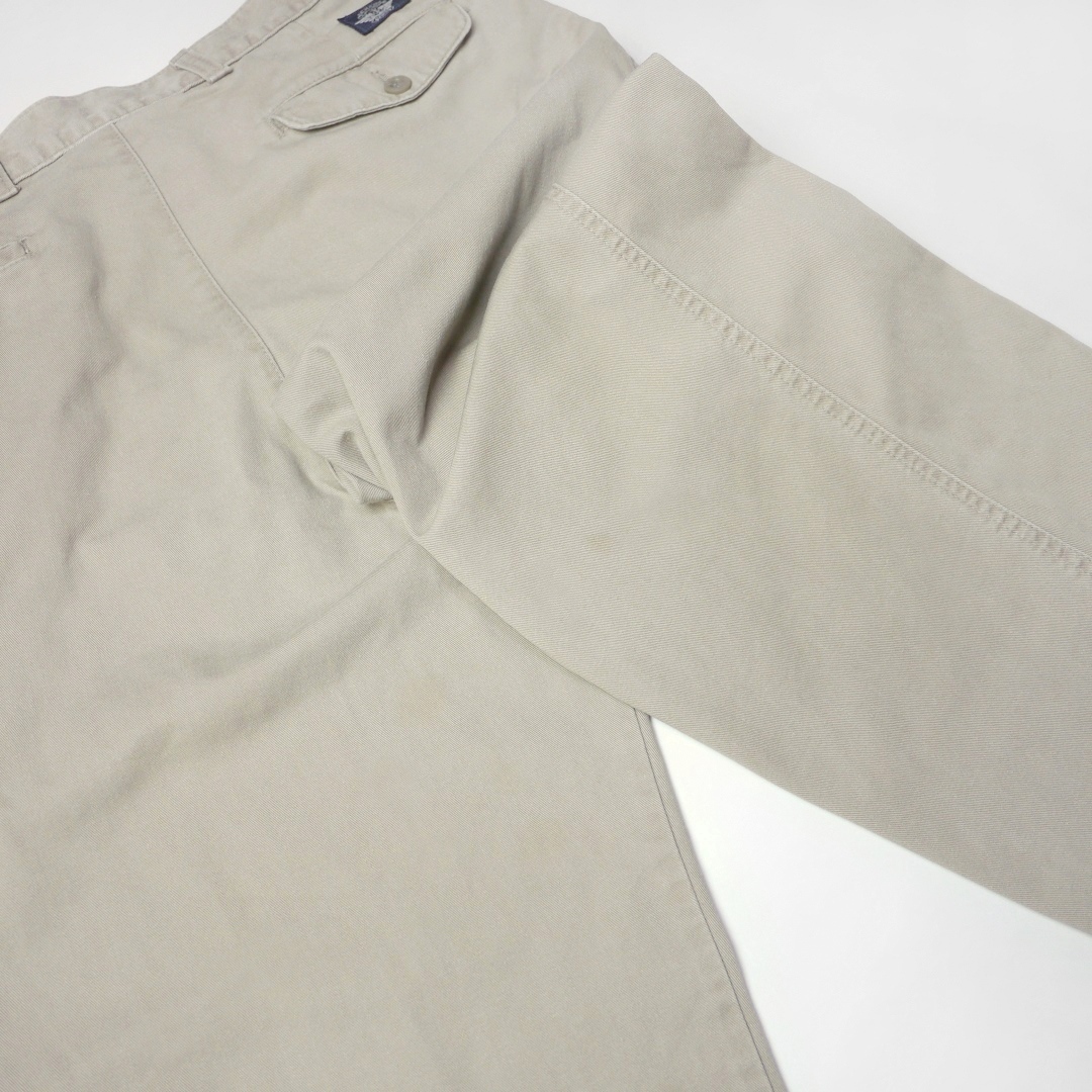 ■ブランド 80s-90s、LEVIS、DOCKERS、MADE IN USA ■素材 100%COTTON ■カラー ベージュ/ライトベージュ、グレージュ系 色味の表現が難しいのですがくすんだ感じの色味になります。 ジッパーテープがカーキブラウン系なので薄茶色が混じった感じだと思います。 ■詳細 アメリカで購入したリーバイス/ドッカーズのコットンツイルパンツです。 80年代-90年代(1991年製)、旧タグのアメリカ製で生地はシッカリとしたオールコットンになります。 シルエットはほどよくユッタリとしたツータック入りのテーパードです。 イイ感じに雰囲気よく経年変化しております。 ■状態 コットン特有の色落ち、フェード、アタリ、多少の毛羽立ち、薄めのセンターシームあと、モモにミリ単位のペンあと、モモ後ろに小さな薄染み数点、左前など製織時に生じたミリ単位の織傷あり。 着用に問題あるダメージはなく良好です。 ■サイズ 表記 W33 L30 (実寸W33 L29 *下記参考下さい) ウェスト 42cm×2 股下 74cm 総丈 102cm 裾幅 21cm 股上前 30cm 股上後 42cm ワタリ 35cm ヒップ 52cm-56cm ■注意事項 状態は細かく確認しておりますが、傷や汚れの見落とし、実寸誤差、色味差異など生じる場合がございます。 不明な点がありましたら入札前にご質問下さい。 商品にあわせて洗濯やクリーニングメンテナンスを施しておりますが、ビンテージやアンティークなど中古品になりますので特性のご理解をお願いします。 |
