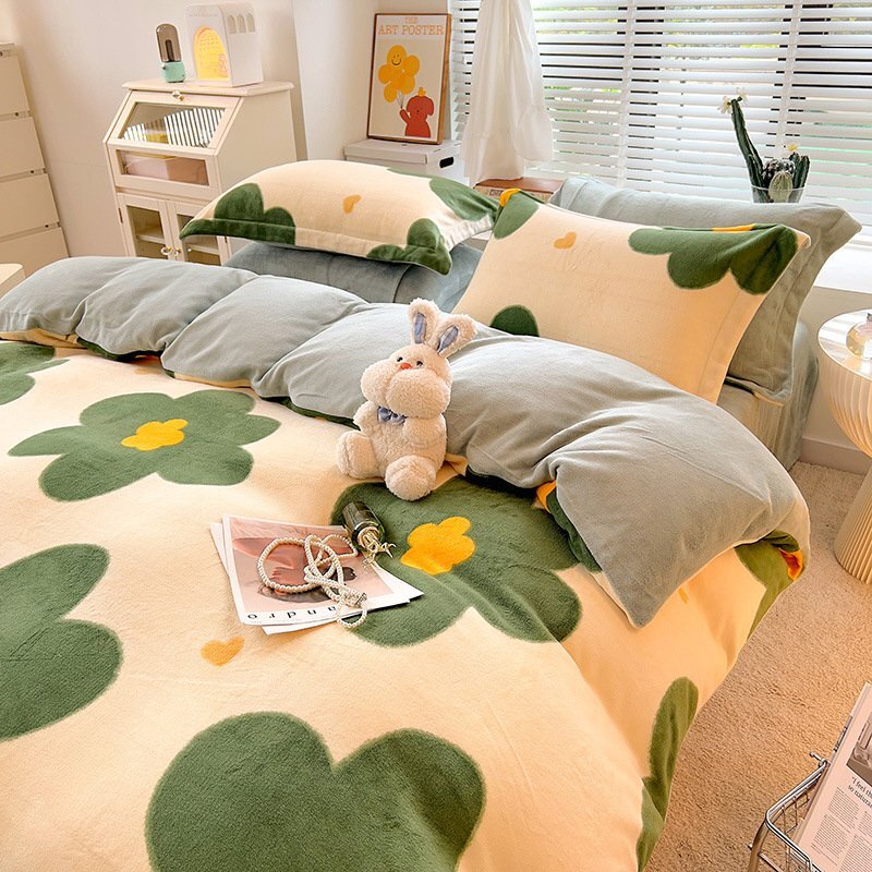 シーツ4点セット ボア掛け布団カバーセット ふとんカバー 枕カバー 静電気防止 暖かい 防寒 花柄 クイーン1.8Mベッド用ボックスシーツ