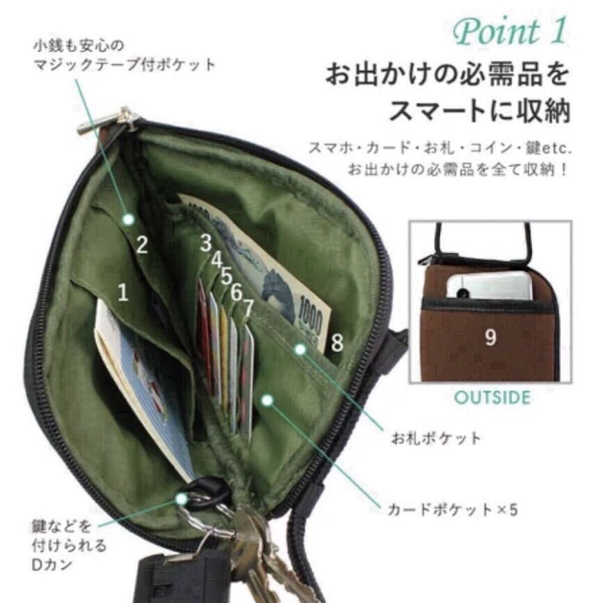 スマホ・カード・現金・鍵など、お出かけの必需品を全て収納して、手ぶら感覚でお出かけできるのが嬉しいポイント。