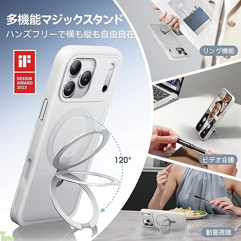 ケースは横向き・縦向き両方で使用可能なスタンド機能を備えMagSafe対応の無損充電にも対応しています。