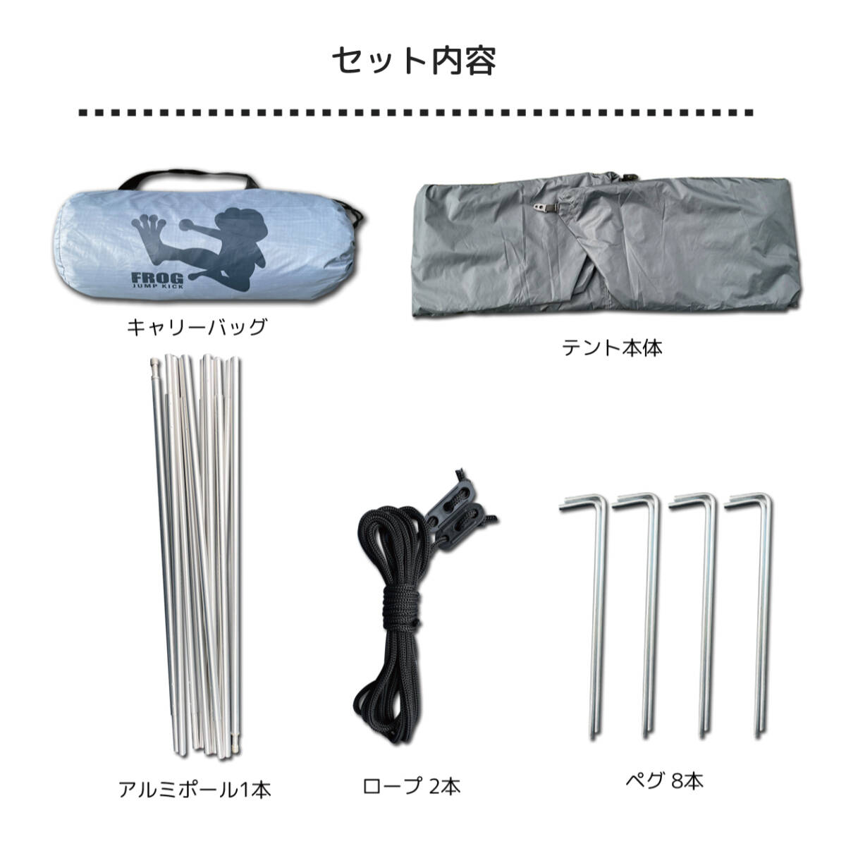 テント、アルミポール1本、ペグ8本、ペグバッグ、ロープ2本、キャリアバッグ