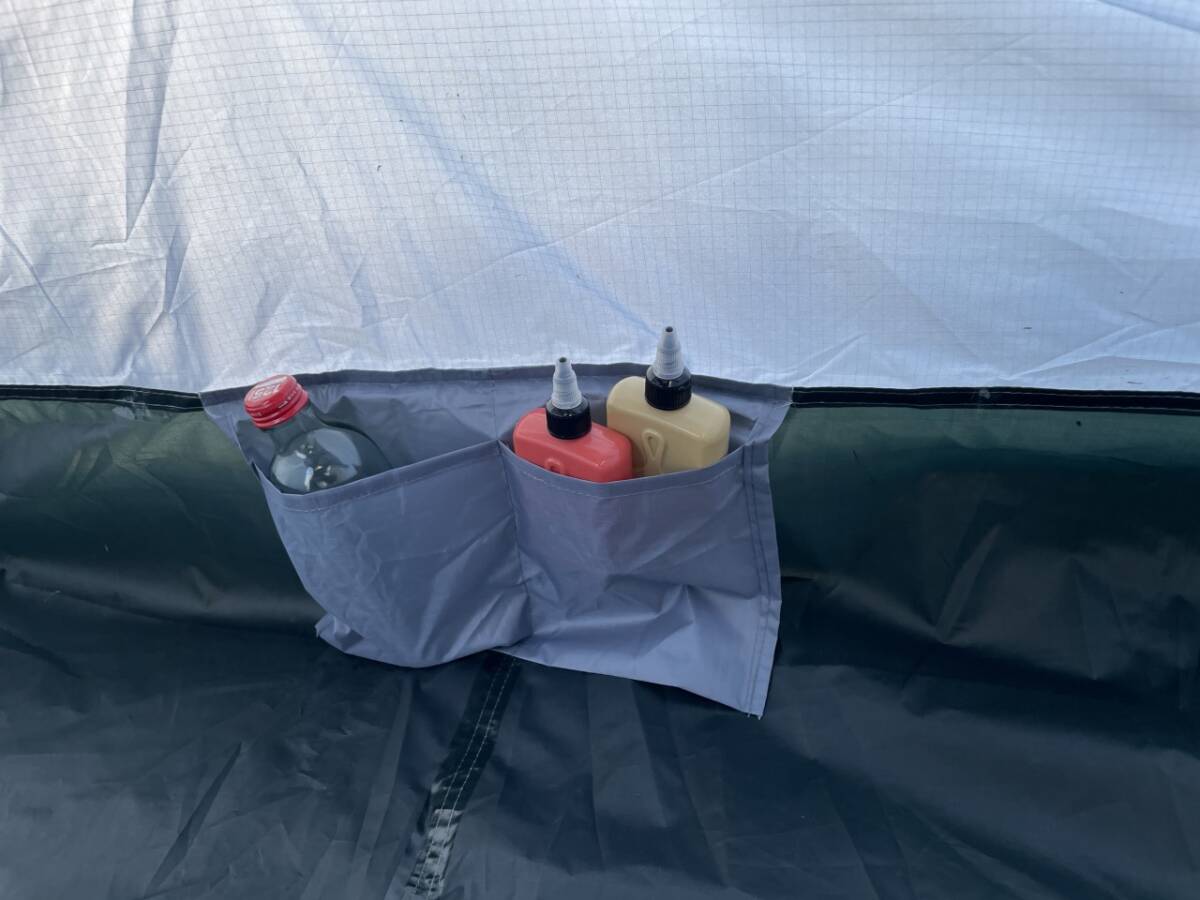 ・防水生地を使用し防水テープにて防水加工を施していますが、雨量や風量によりファスナー部や縫い目部より浸水する場合があります。タープと併用することで軽減することができます。