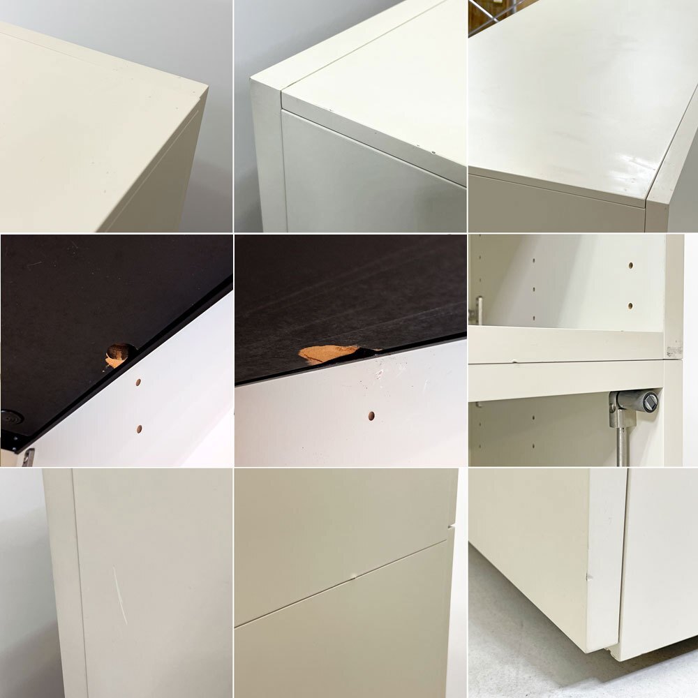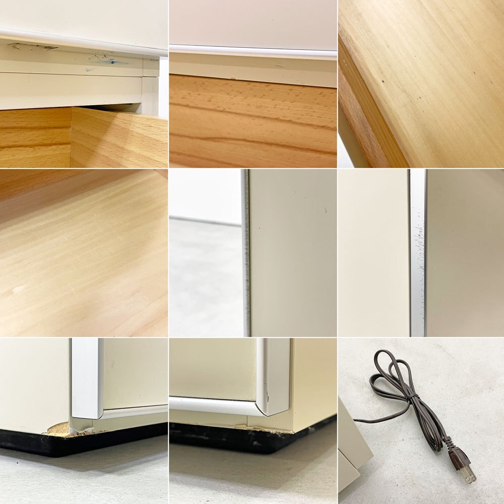 | コンディション | 使用に伴う擦れや傷、打痕、インク痕などの取り切れない汚れが各所に散見され、天板には表面塗装の劣化に伴うテカリが複数見られます。 また側面下部にやや目立つ突板の剥がれが見られる他、最下段の抽斗下側にガリ傷が見られますが、ご使用の際は死角になる部分の為気にならない程度かと思われます。 なお、最上段と二段目、下段のドロワー3杯は構造上分割が可能となりますが、庫内上部の連結用カムロック部分が破損・パーツの欠品をしていることから、固定ができておりません。現状重ねただけの状態でもご使用に問題はございませんが、ご移動される際などには十分ご注意くださいませ。 その他機能を著しく損なうダメージはございませんが、上記コンディションを鑑みてお求めやすい価格にてご提供いたします。 画像や記述をよくご確認の上、ご購入をご検討くださいますようお願い申し上げます。 ※特筆すべきコンディションは出来るだけ記載させて頂きますが、細かい擦れや傷、汚れ等を完全にお伝えする事は出来ません。画像をご確認の上、ご入札をご検討下さいませ。 ※取扱説明書や保証書等は記載が無い限り付属いたしません。 |