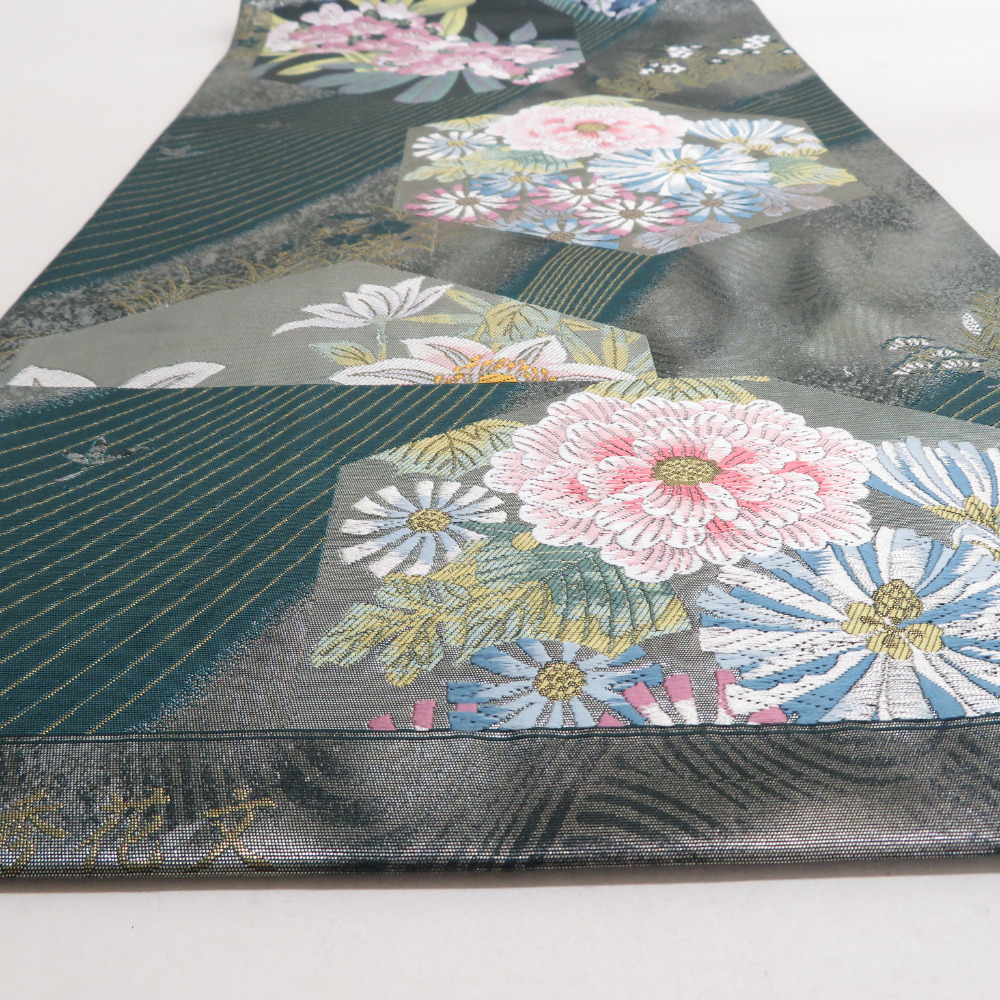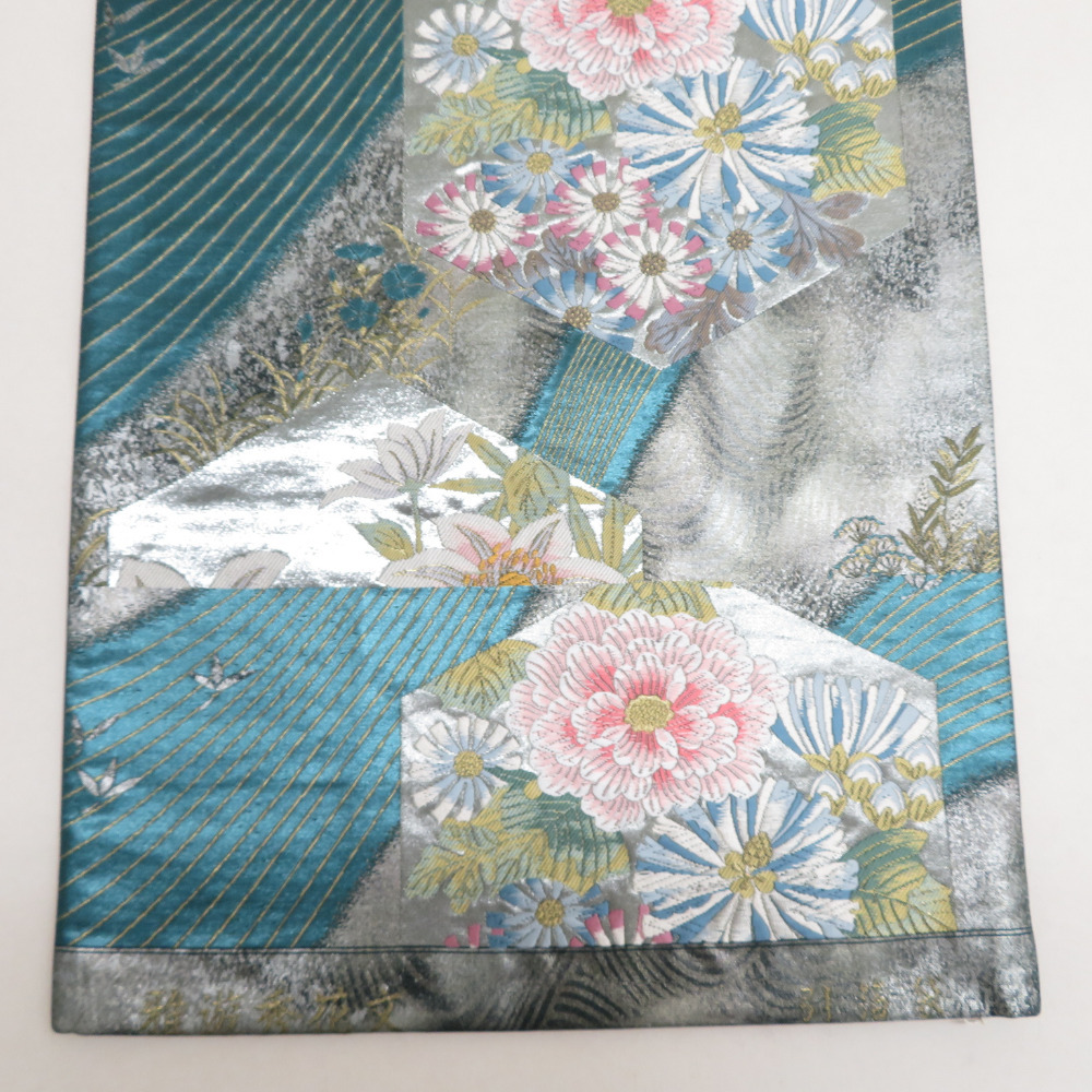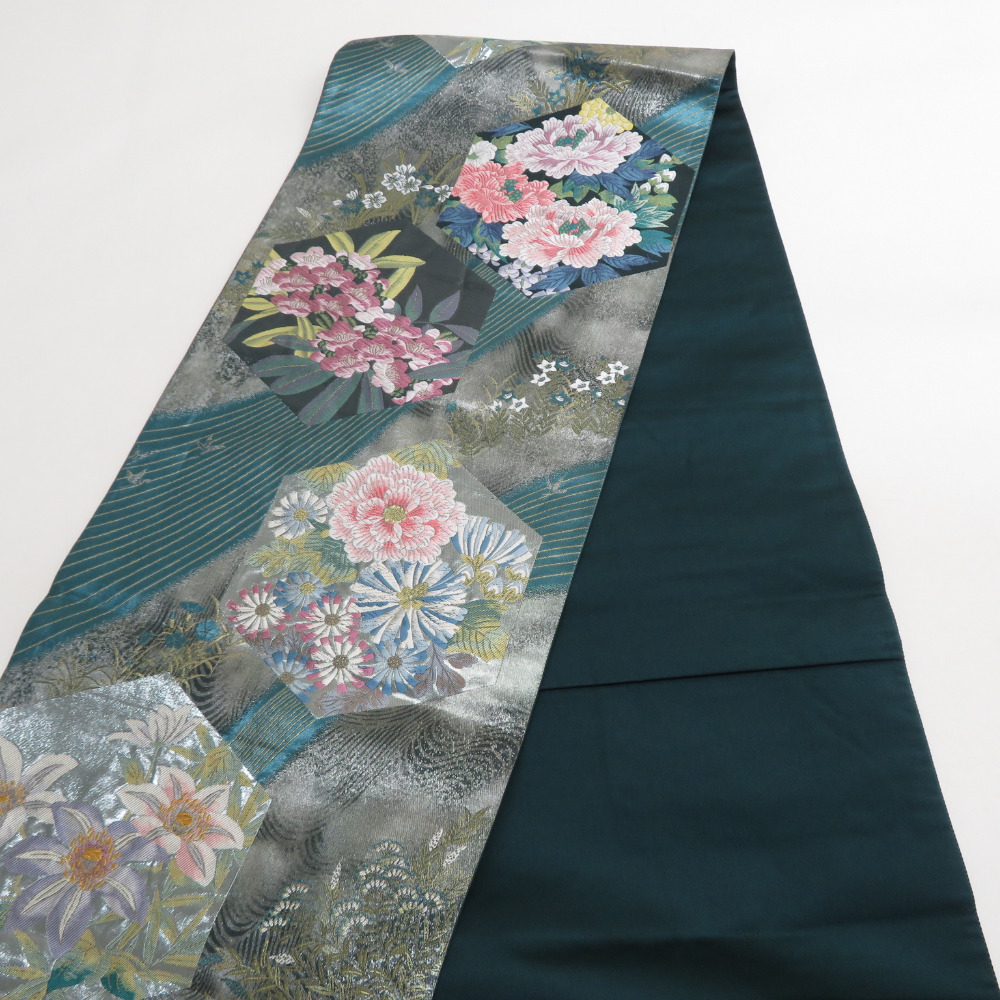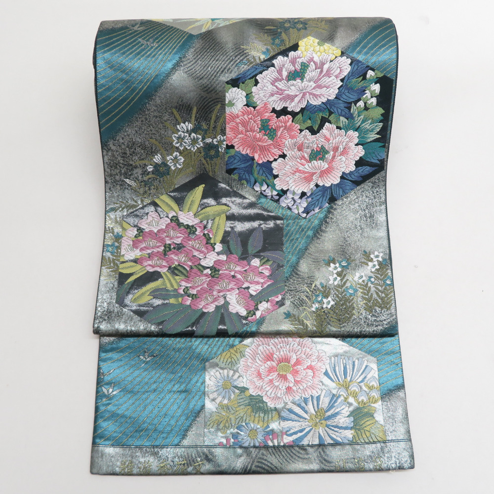 | 袋帯 正絹 銀糸 ターコイズブルーxピンク色x銀色 六角に花々文様 引き箔 六通柄 フォーマル 礼装 長さ440cm |