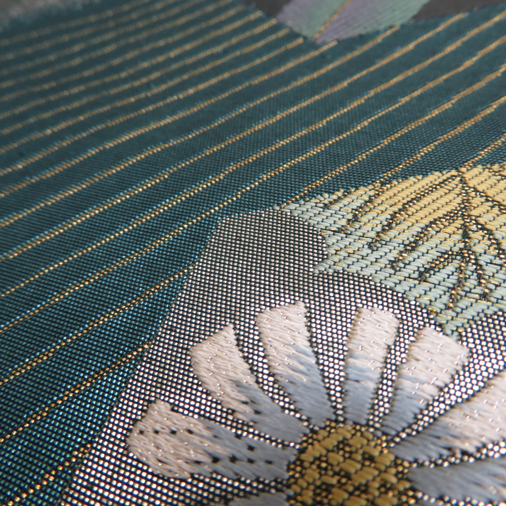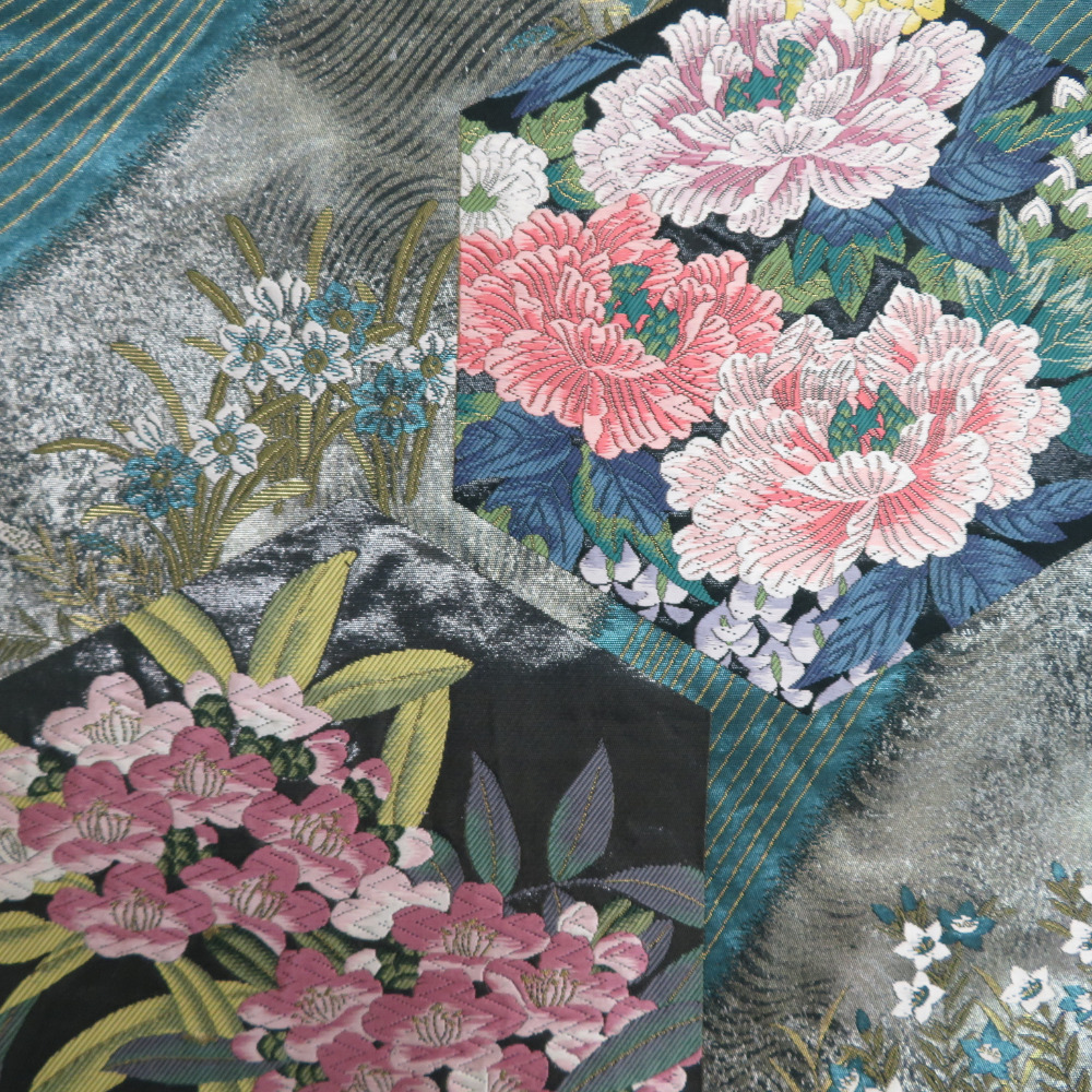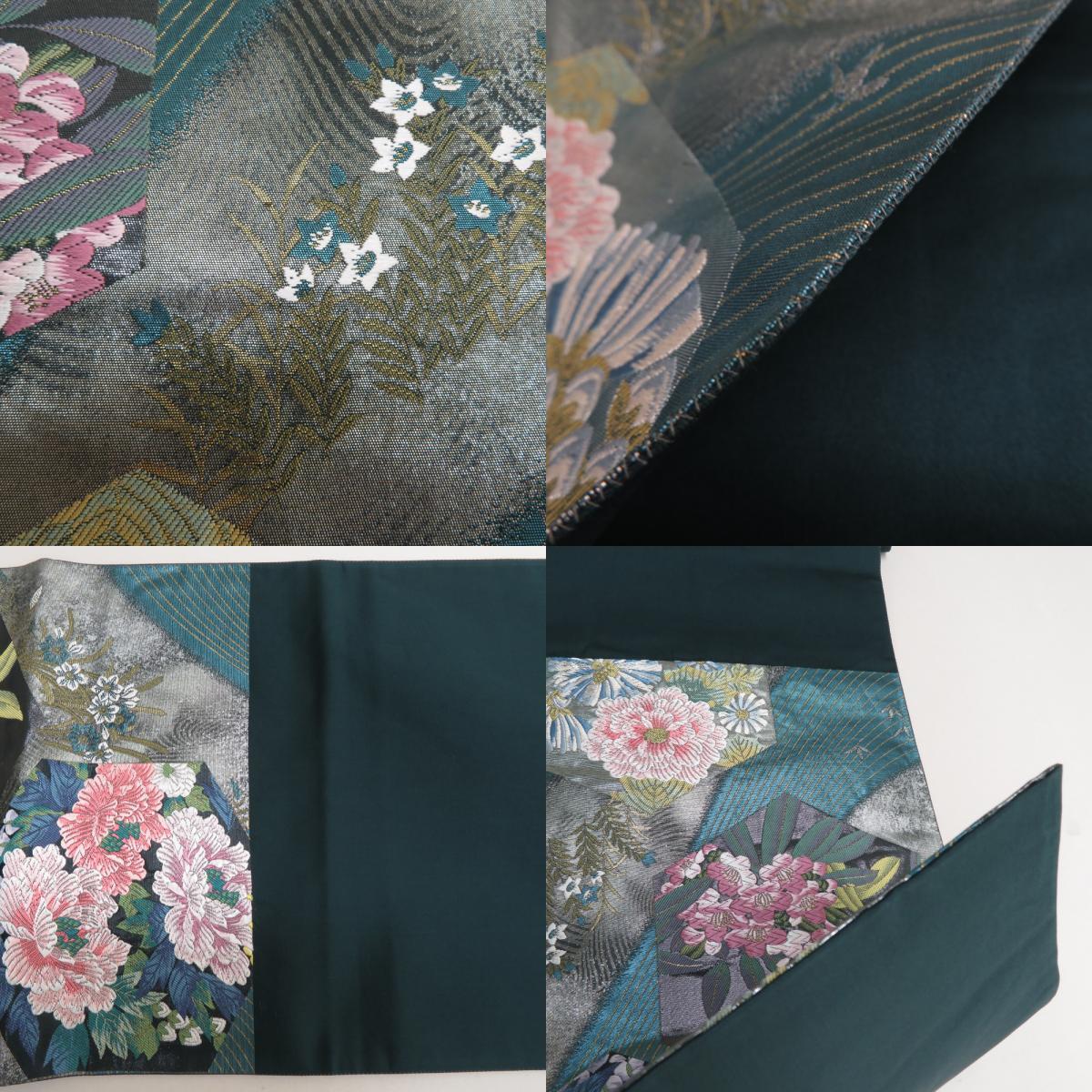 | 袋帯 正絹 銀糸 ターコイズブルーxピンク色x銀色 六角に花々文様 引き箔 六通柄 フォーマル 礼装 長さ440cm |