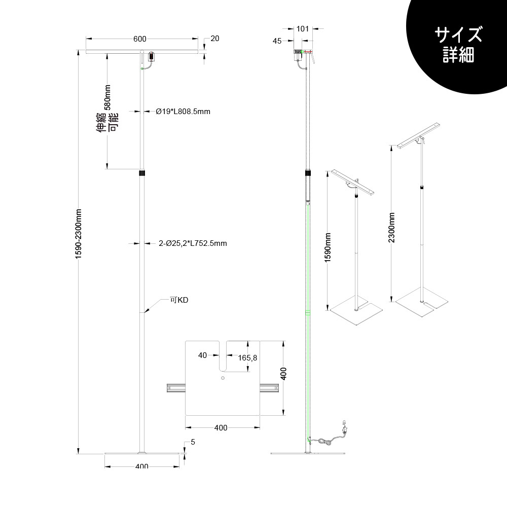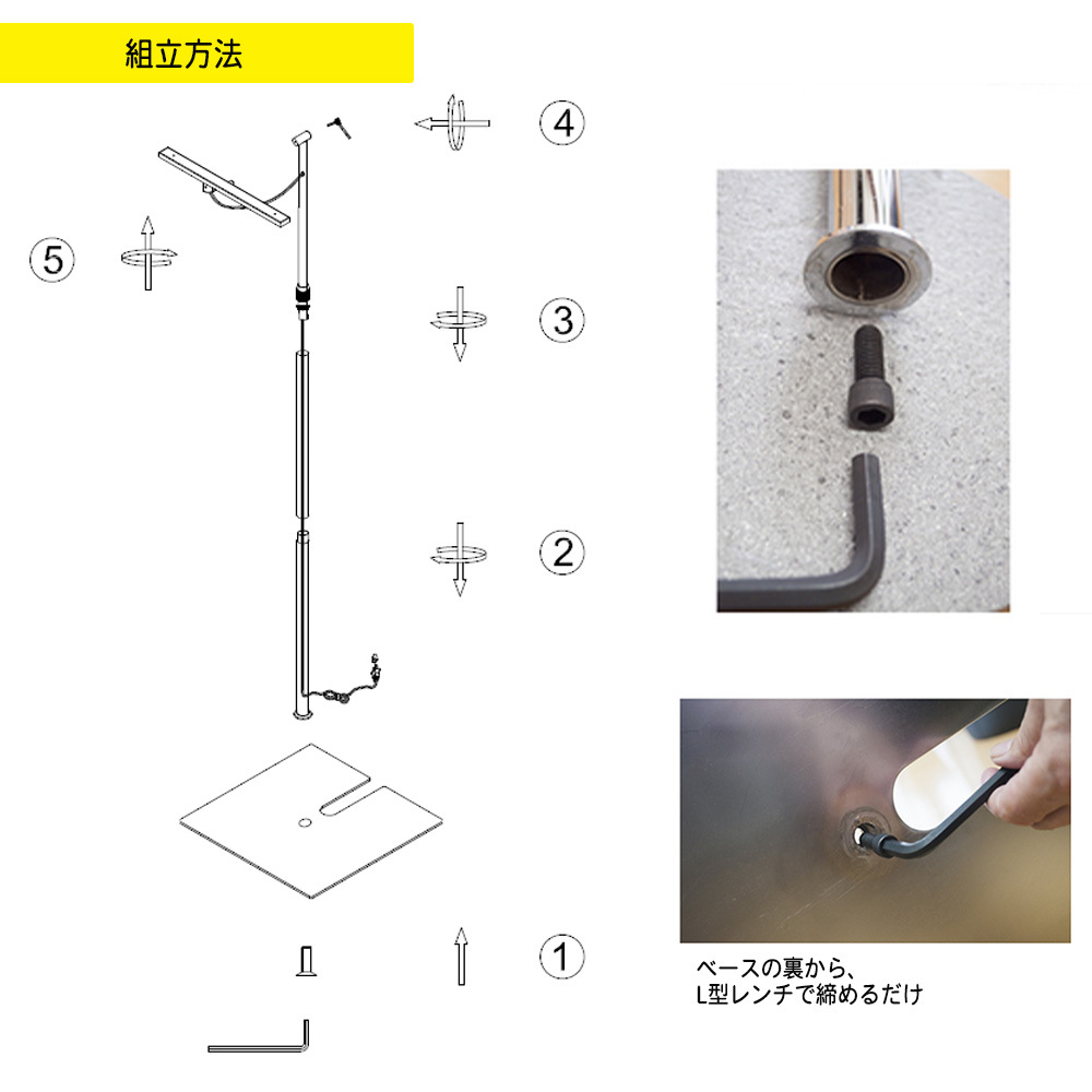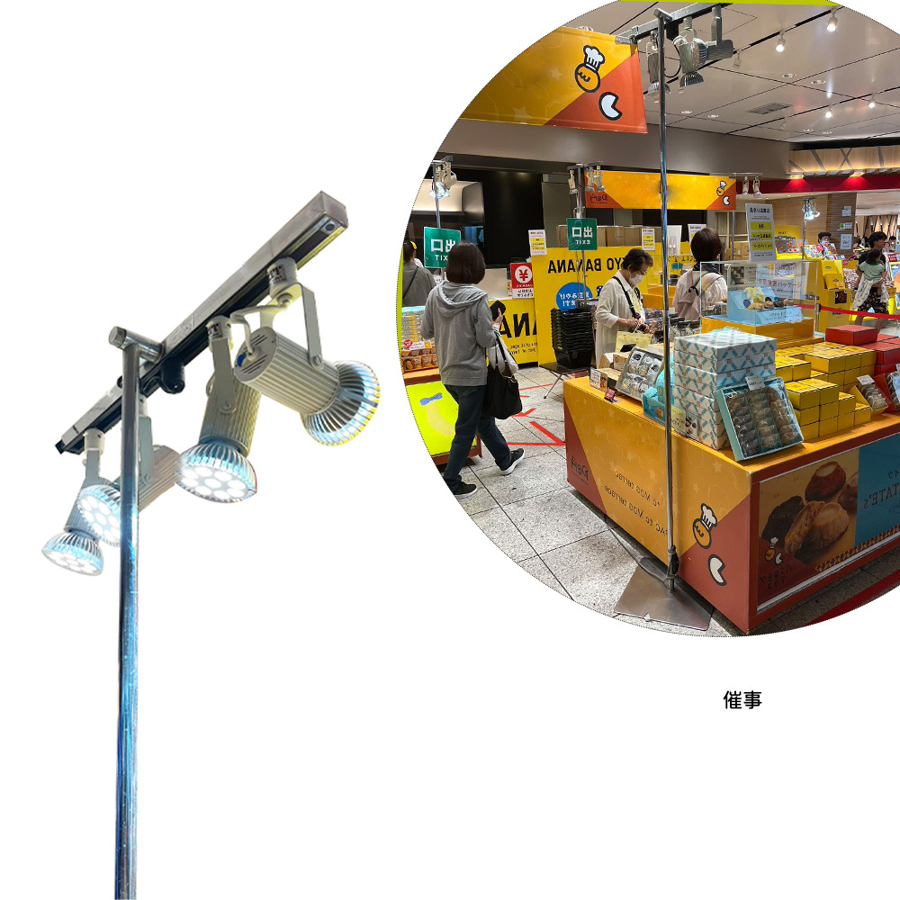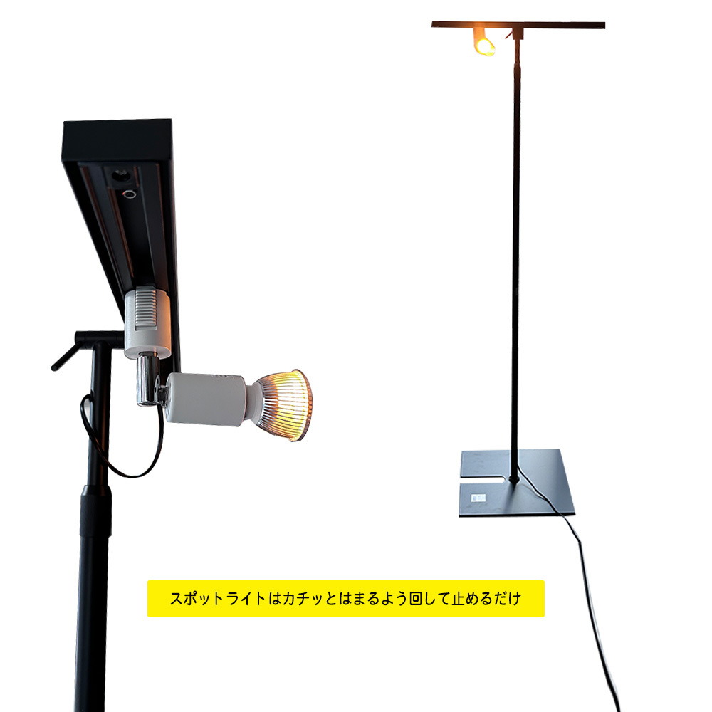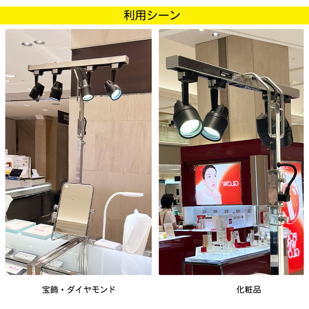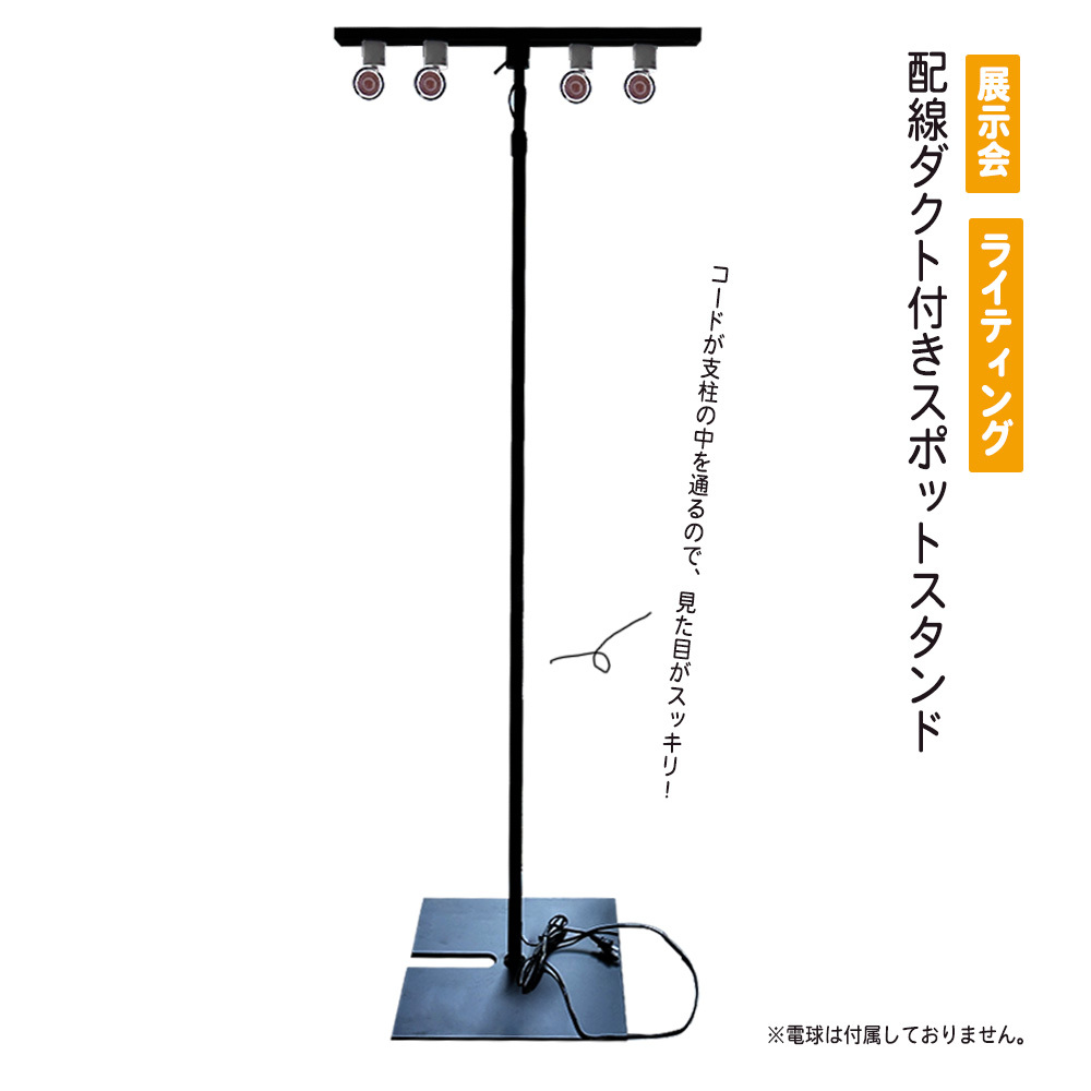 展示会・イベント・催事などにおすすめ●素材:スチール製 クロームメッキ●サイズ(cm):W60×H160~230cm●ライト: 約4ケ装着できます※スポットライトは付属しておりません。(別売)※1ケあたり100Wの電球まで対応可能(合計400Wまで)●お届け状態 お客様組立式●納期 :在庫確認後、2営業日~4営業日後出荷予定(時間指定・日祝配送不可)・コードがすっきりと収納できる配線ダクト付きスポットスタンド。 ※こちらの商品は「照明スタンド」です。照明器具としてお使いいただく場合には本商品の他、「スポットライト(ソケットパーツ)」、「電球」が必要です。(スポットライトと電球が一体型になっているものはそれのみで可)従来のスポットスタンドは電源ケーブルが支柱の外にぶら下がっている状態でした。見た目があまりよくないのはもちろん、通路の近くに設営した場合はケーブルにバッグなどをひっかけて転倒してしまう恐れもあります。・コードを支柱に収めることによって、見た目はもちろん、転倒の危険性もなくし、さらには持ち運びの際にも扱いやすい設計となっております。レール部分を垂直に角度固定できますので、収納時はとてもコンパクト。組み立て式なのでさらに分解して持ち運ぶことも可能です。スポットライト(ソケットパーツ)は一つのスタンドに付き4個装着することができ、市販のもので配線ダクトレールに対応であれば取り付けが可能です。LEDを中心にギフト商品を扱っております。