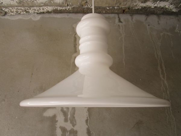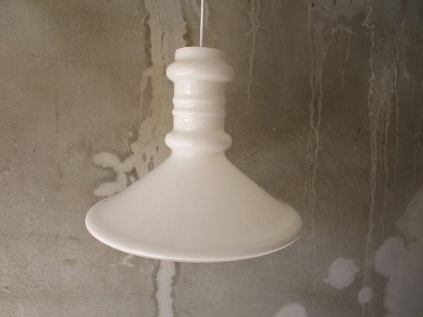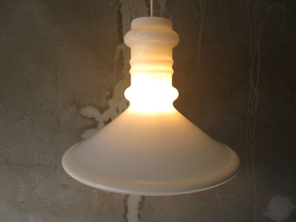 ブローイングで成形された合わせガラスの、シンプルな円錐形に、ギリシア神殿の柱を想わせるシャフトがアクセントになったミニマムなデザインで、安定感があり、オパールガラスで作られているため、点灯した際に放たれる柔らかな光が美しく、長くお使いいただけそうな良質なペンダントライトです。そこそこボリュームがあり、大きさ的にダイニングテーブルなどのメインライトとして活躍してくれそうです。