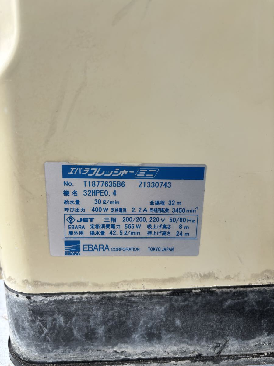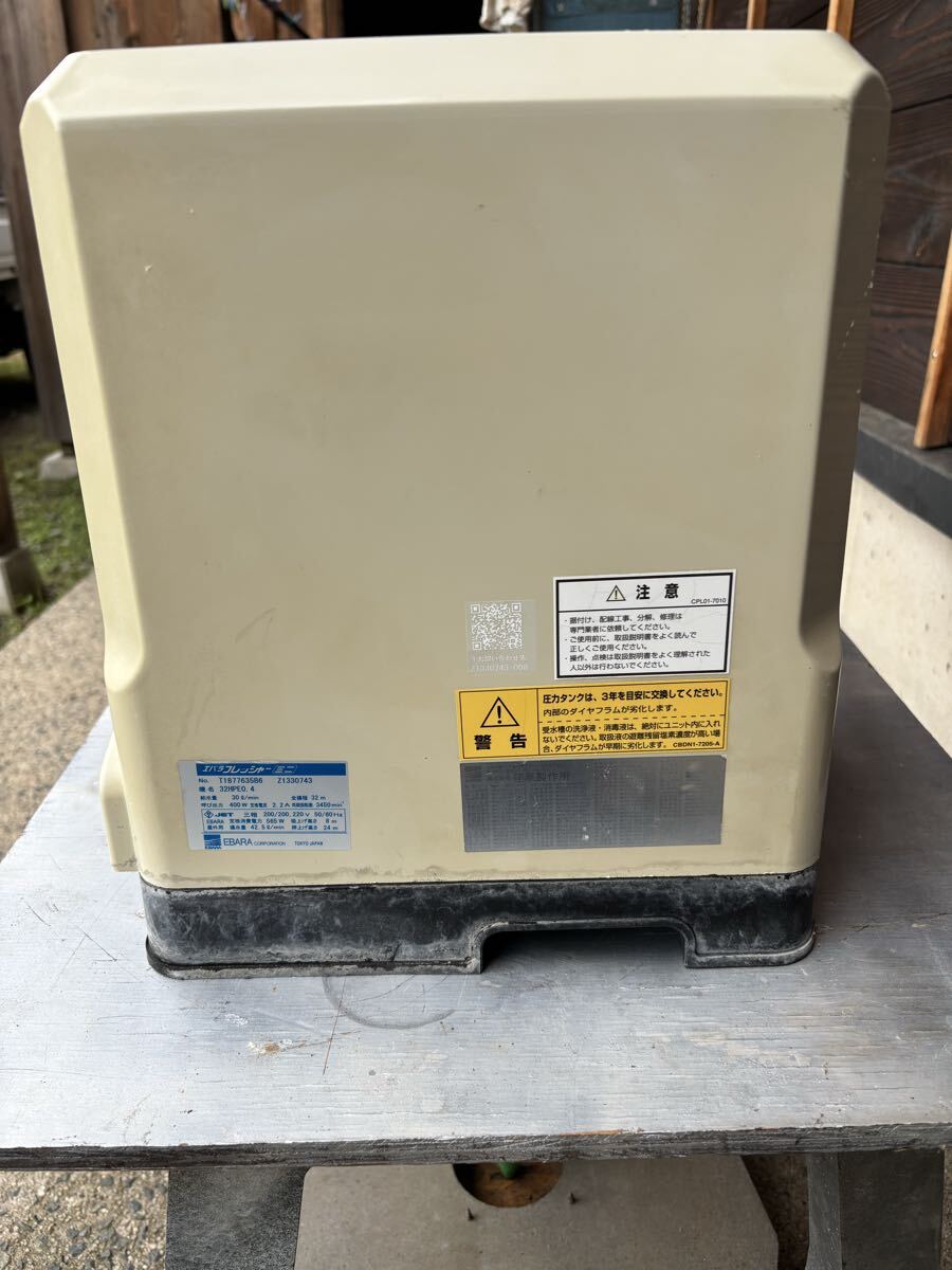 荏原製作所の家庭用インバータ式井戸ポンプ「エバラフレッシャーミニ」32HPE0.4です。通電とモター回転は確認済みです。