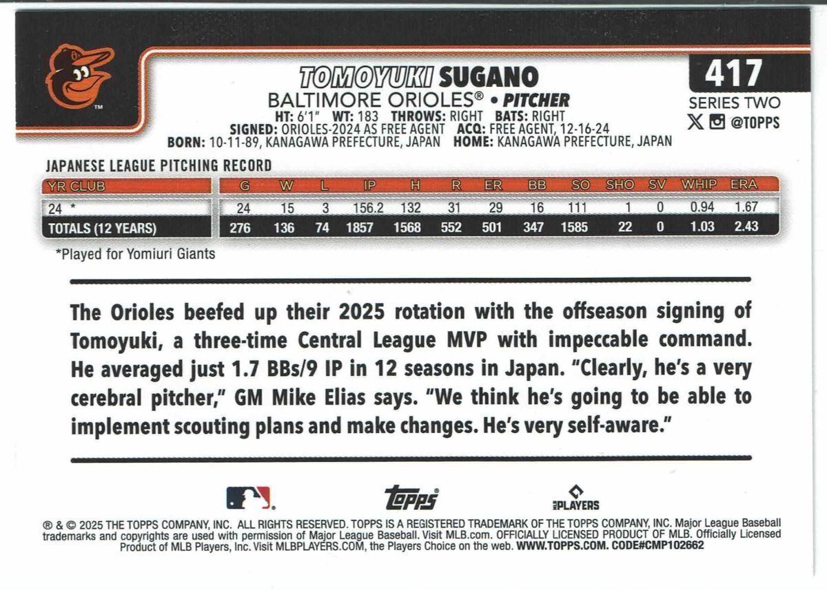 菅野智之 2025 Topps Series 2 #417 RC ベースカード - Orioles オリオールズ