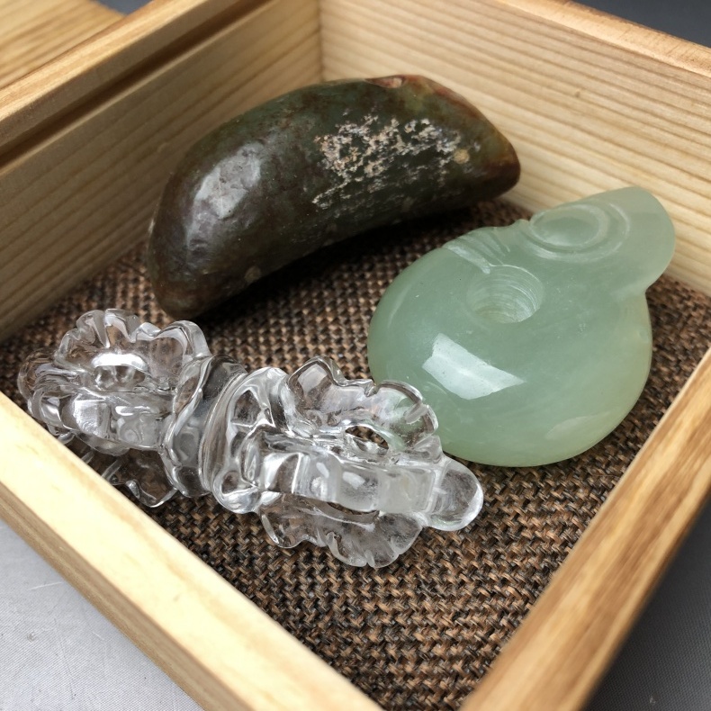 玉製 水晶 土偶 勾玉 弥生縄文古墳須恵器根付 重さ138g 三点共箱