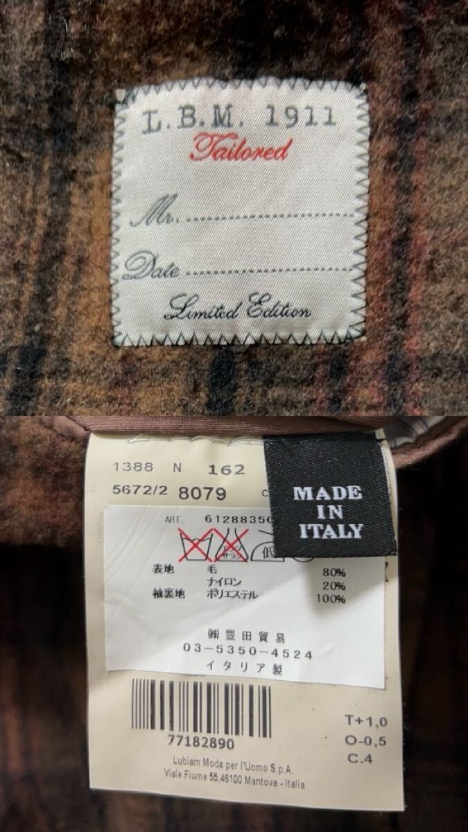 【極美品】秋冬物 L.B.M.1911 ルビアム ナッピング加工生地使用 メンズ ジャケット 48 L ブラウン 製品洗い イタリア製