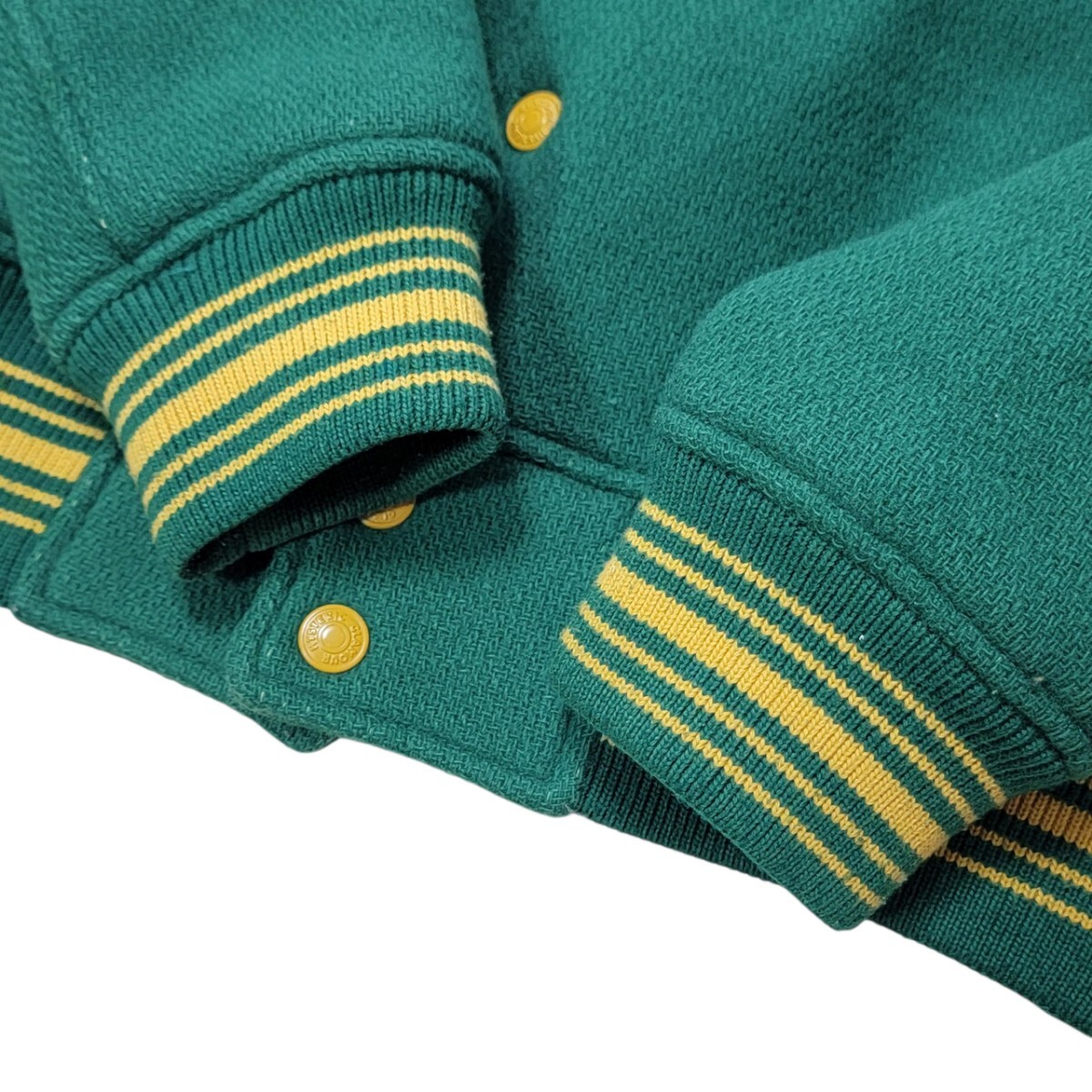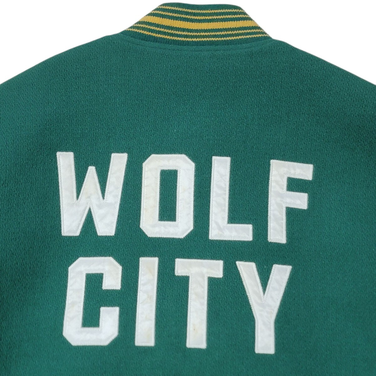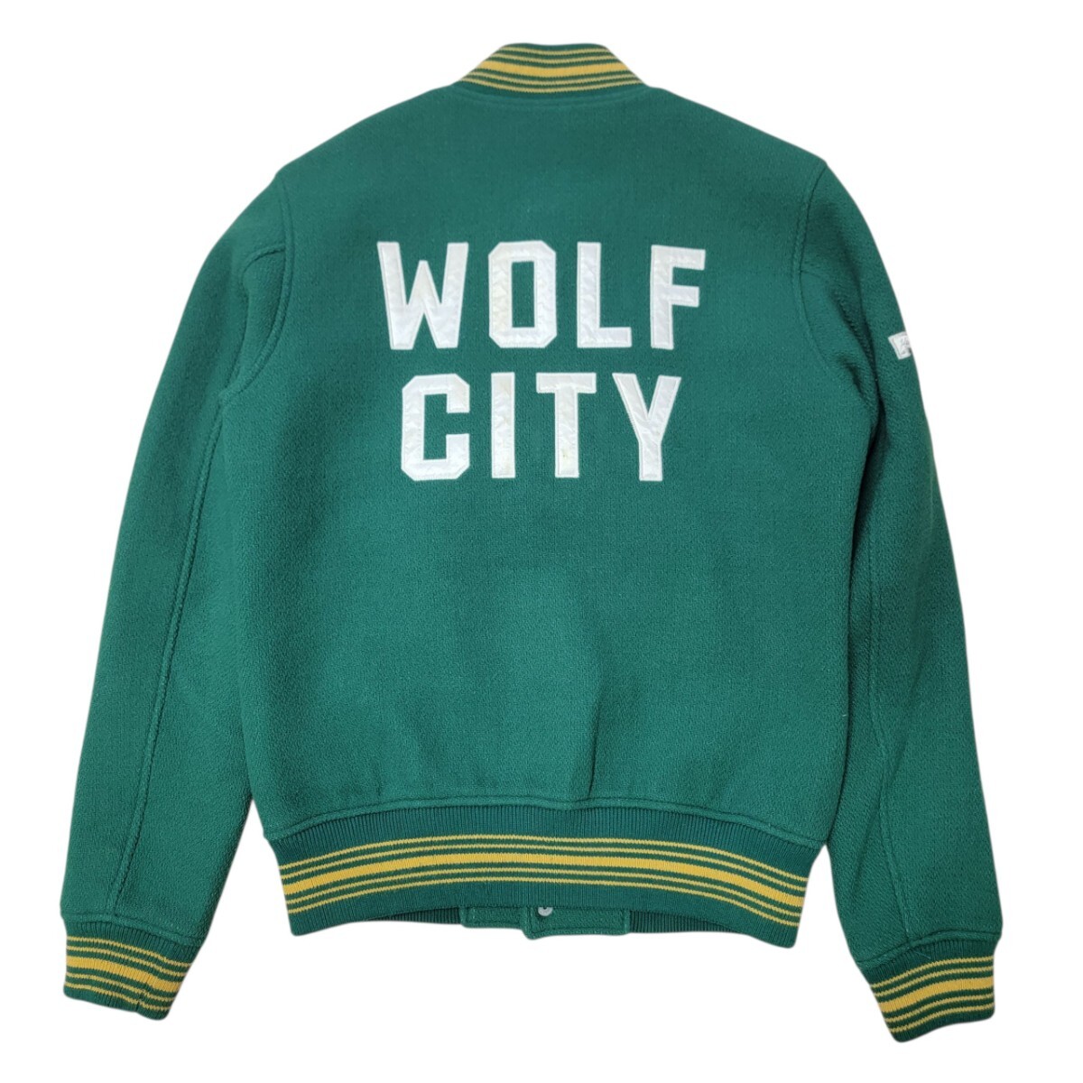 カレッジスタイルやアメカジの要素が強く、グリーンとイエローの配色が目を引く一着です。「WOLF CITY」のバックプリントも相まって、ストリートファッションにも合う、存在感のあるアウターです。