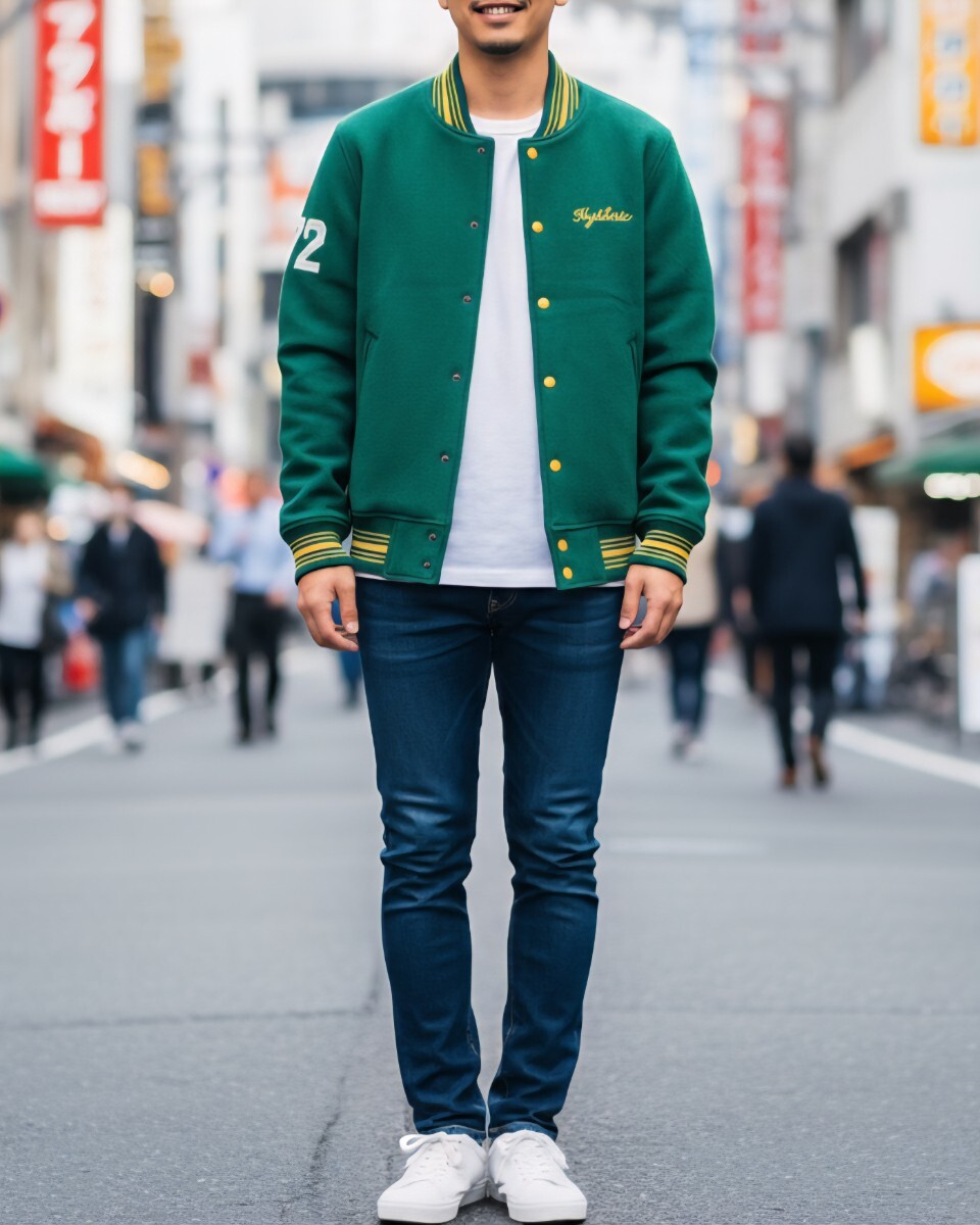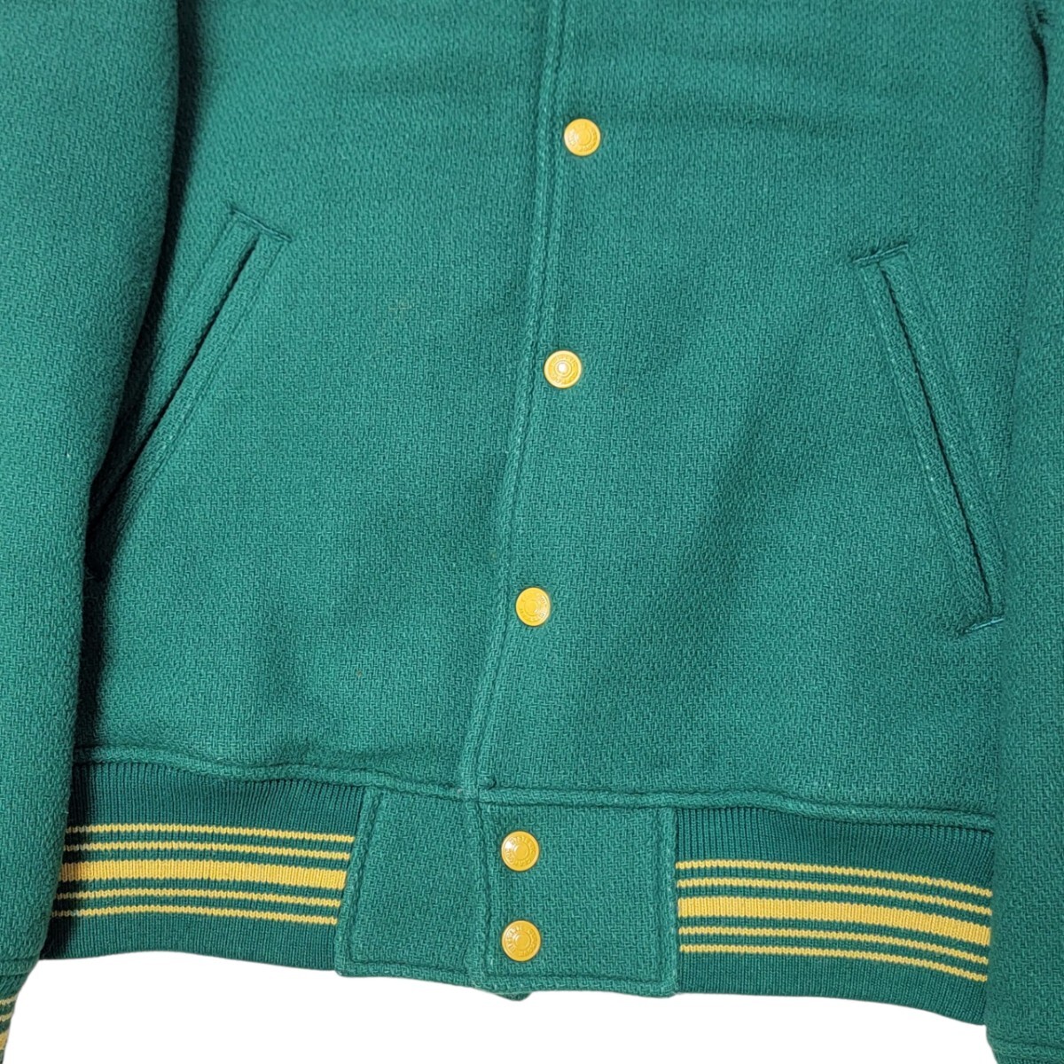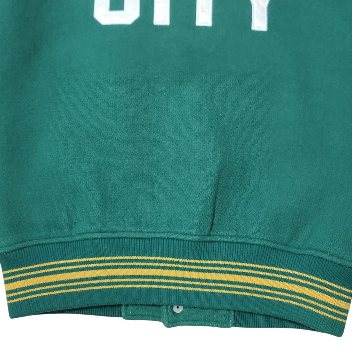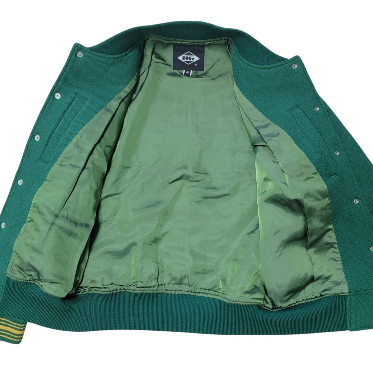 カレッジスタイルやアメカジの要素が強く、グリーンとイエローの配色が目を引く一着です。「WOLF CITY」のバックプリントも相まって、ストリートファッションにも合う、存在感のあるアウターです。