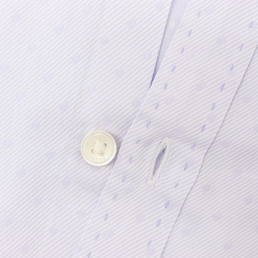 さらりとしたタッチのコットン生地を使用したワイドカラーシャツです。ラベンダー系の華やかなカラーとドット柄がアクセントになる生地を用いて、上品な雰囲気漂う一着に仕上げられています。