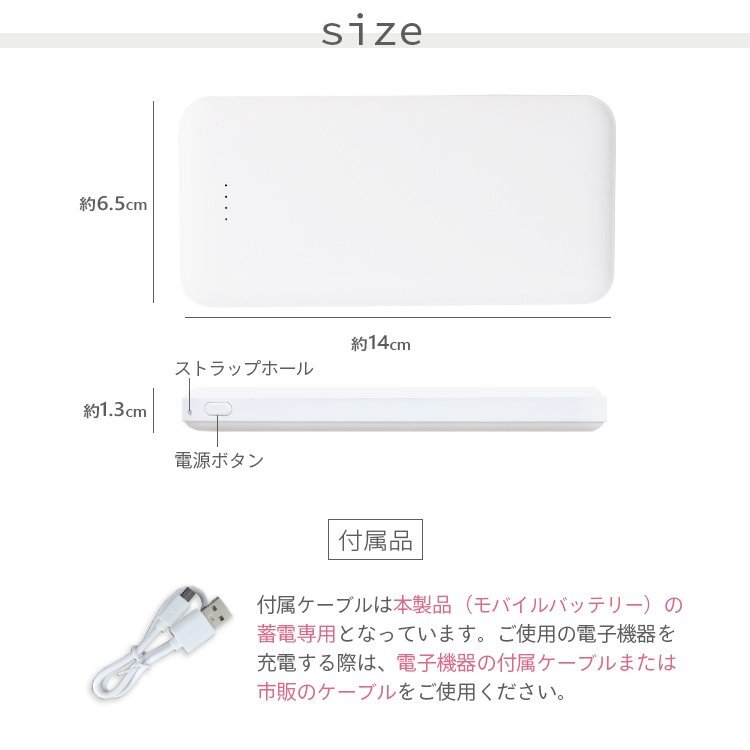スマホとほぼ同じサイズなので小さなバッグにも楽々持ち運べます。 機内持ち込みt対応で旅行や出張先にも最適! モバイルバッテリーには珍しい4種類カラバリ! 無機質な印象になりがちなスマホ周りも明るい印象に! たっぷり大容量12800mAh! iPhoneXなら約2.5回充電が可能。 2台同時充電だから家族や友達とシェアできます。 さらに最大2.1Aと高出力なのでiPadなどのタブレットやゲーム機にも充電もOK! 内容:本体・microUSBケーブル カラー:ネイビー 対応機種:iPhone、Androidなどのスマートフォン、タブレット、iPodなどの音楽プレーヤー、ゲーム機など ※iPhoneやゲーム機などを充電する場合は、普段お使いの充電ケーブルまたは別途ケーブルをご用意ください。 出力: ・5V/2.1A(USB1) ・5V/2.1A(USB2) ※合計最大2.1A バッテリー容量:12,800mAh サイズ:(約)140×65×13mm 重量:(約)240g |