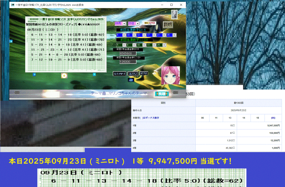 2025年09月23日 ( ミニロト )  1等  9,947,500円   当選です!