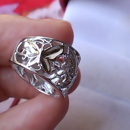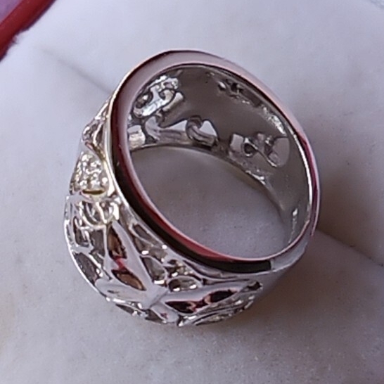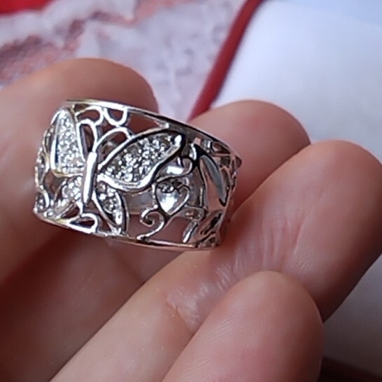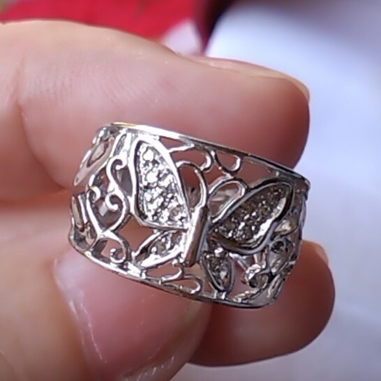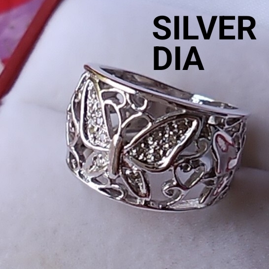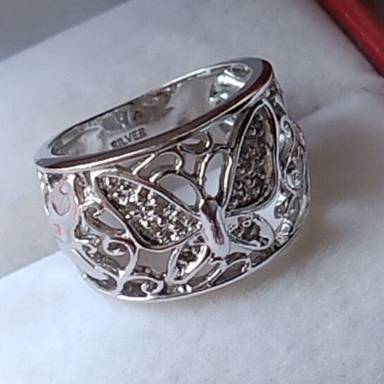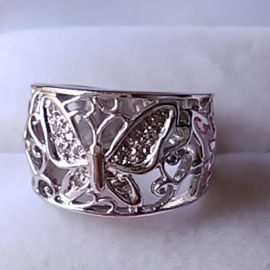 シルバー製の蝶モチーフリングです。ダイヤモンドの装飾が施され、手の込んだ透かしがあり、オープンワークデザインで華やかです。