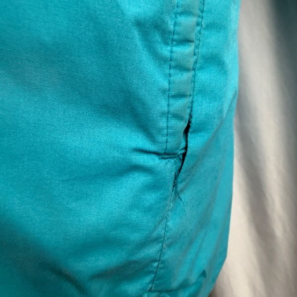 ところどころに薄汚れ、襟付近にキズ、ポケット上にステッチほつれやぶれ
