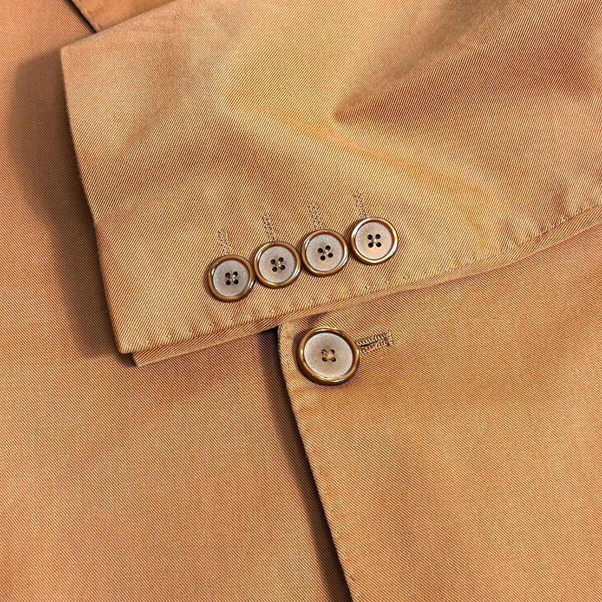 デザイン:フロント2つボタン、背抜き裏地、サイドベンツ、袖開き見せ。