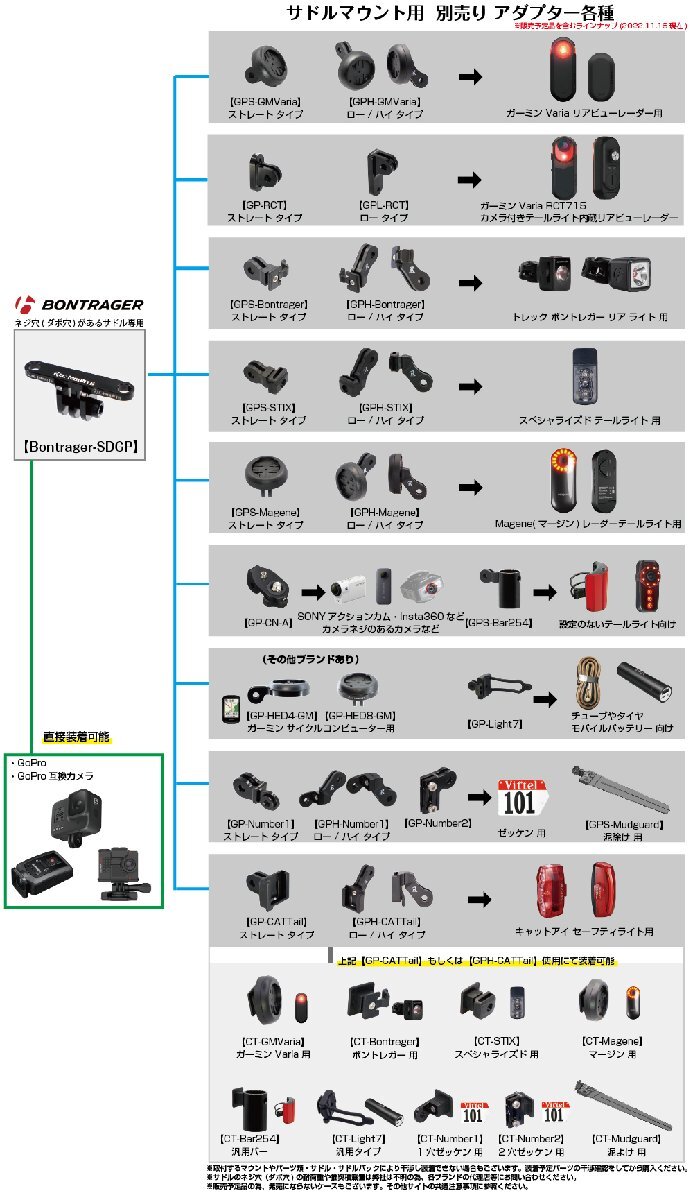 GoPro HEROシリーズのカメラ または ゴープロインターフェイスのある互換性があるカメラや、GPの型番で始まるセーフティライトアダプター・テール系アダプター(泥除け/ゼッケンなど)・カメラアダプター・ライトアダプター・サイクルコンピューターアダプターなどが取付可能