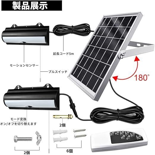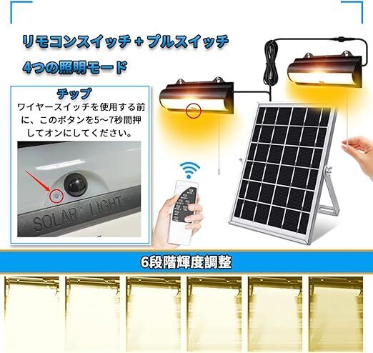 【新開発センサーライト・4つの照明モード】4つの照明モードを備え、各ランプにモーションセンサーが装備されているこのソーラーペンダントライトは、モーションによってトリガーされます。モード1(暗くなるとほのかに光り、人を感知すると設定した明るさに光り、離れると10秒後にほのかに光ります)。とモード2(暗くなり人を感知すると設定した明るさに光り、離れると10秒後消えます)。モード3(モーションセンサーソーラーライトは夕暮れ時に点灯し、夜明けに消灯します。人の動きには反応しません)。とモード4(明るい所でも光るただのライトになります。引きひもか、リモコンでON OFF します。)。[チップ]主電源は、ライト本体の黒い赤外線センサーの左側にあるボタンを5秒押しっぱなしすると、ライトが点灯します点灯しない時はひもを引くと点灯します。【知らせ】ライトの明るさを確保するために、バッテリーの電力が500mAh未満の場合、ライトの1つだけが点灯します。十分な電力が供給されると、2 つのライトが同時に点灯します。