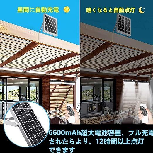 【6600mAh大電池容量・省エネ・電気代ゼロ】内蔵充電池は6600mAh超大容量で、ソーラーパネルは6v6wで、十分な日光が当たる場所に8時間でフル充電されたらより、12時間以上点灯ができます。電気代がかからないのでコストパフォーマンスが最高。ソーラーライトは昼の間に太陽光で自動充電し、夜になると自動に点灯します。地震や台風などの災害で万一電源が停止しても、非常灯としても使え、防犯や避難などに貢献します。