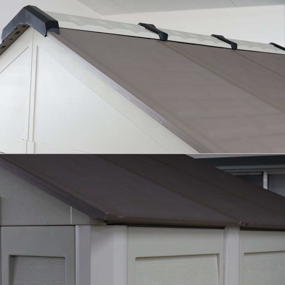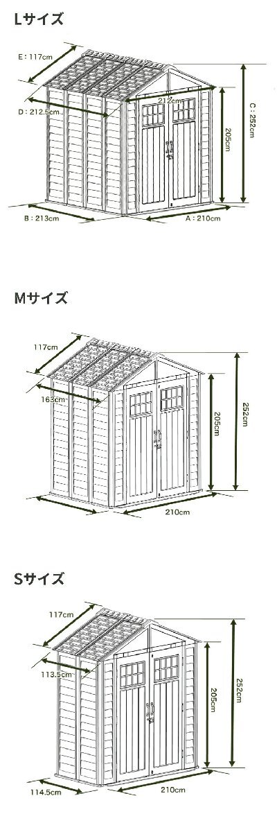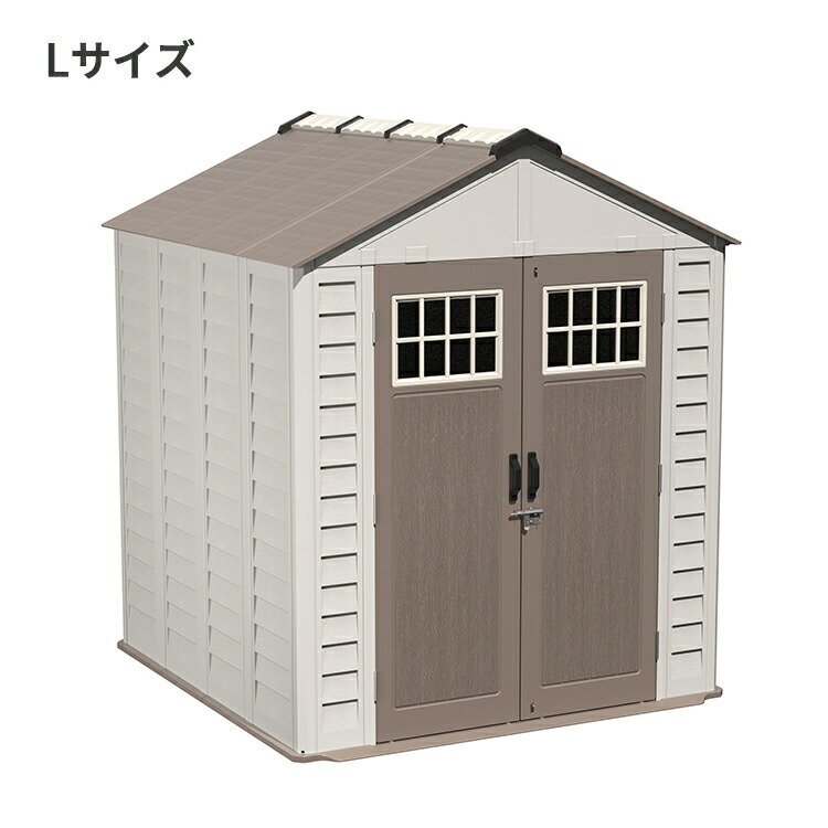 三角屋根のナチュラルなガーデンシェッド。 樹脂製で明るめの色合いなので重厚感がありません。 壁面は木目調の模様をしており、おしゃれな外観をつくりだします。 扉は両開き仕様でちょっとしたスロープ付きだから物の出し入れに便利です。 ガーデニングやキャンプ用品など、まとめておしゃれに隠します。 Sサイズ 【商品詳細】 外寸(約):幅212×奥行き114.5×高さ252cm 重量(約):105kg(セット重量) Mサイズ 【商品詳細】 外寸(約):幅212×奥行き164×高さ252cm 重量(約):125kg(セット重量) Lサイズ 【商品詳細】 外寸(約):幅212×奥行き213×高さ252cm 重量(約):145kg(セット重量) 【設置について】 製品の組み立てや設置にあたり、書類の提出や許可が必要な場合があります。事前にお住まいの地域の規約をご確認ください。 製品の設置には強固で水平な基礎が必要です。 固定用のアンカーは付属しておりません。設置場所に合わせてお客様にてご用意ください。 ※本製品は組み立て品です。 ※本製品は内側から解錠できません。閉じ込め事故にご注意ください。 ※サイズ、重量は自社計測によるものです。実物と若干異なる場合があります。 ※商品輸送中にどうしても若干の傷、へこみなどが出来る恐れが御座います。