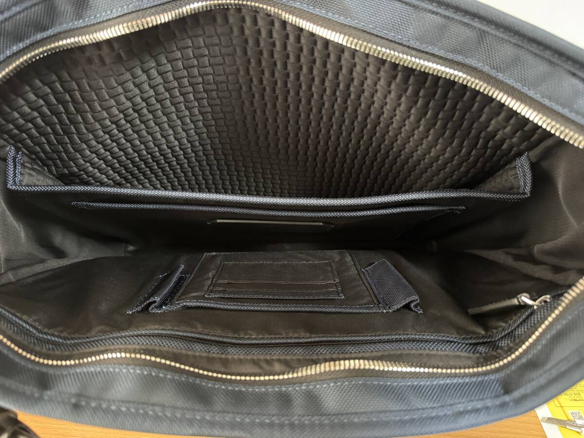 ファスナーによる開閉 サイドのオープンポケット×2(一つには、防水加工を施しています。) フロントのクイック・アクセス・ポケット 背面のアド・ア・バッグ・スリーブ付きファスナーポケット レザー製のハンドル IDタグ