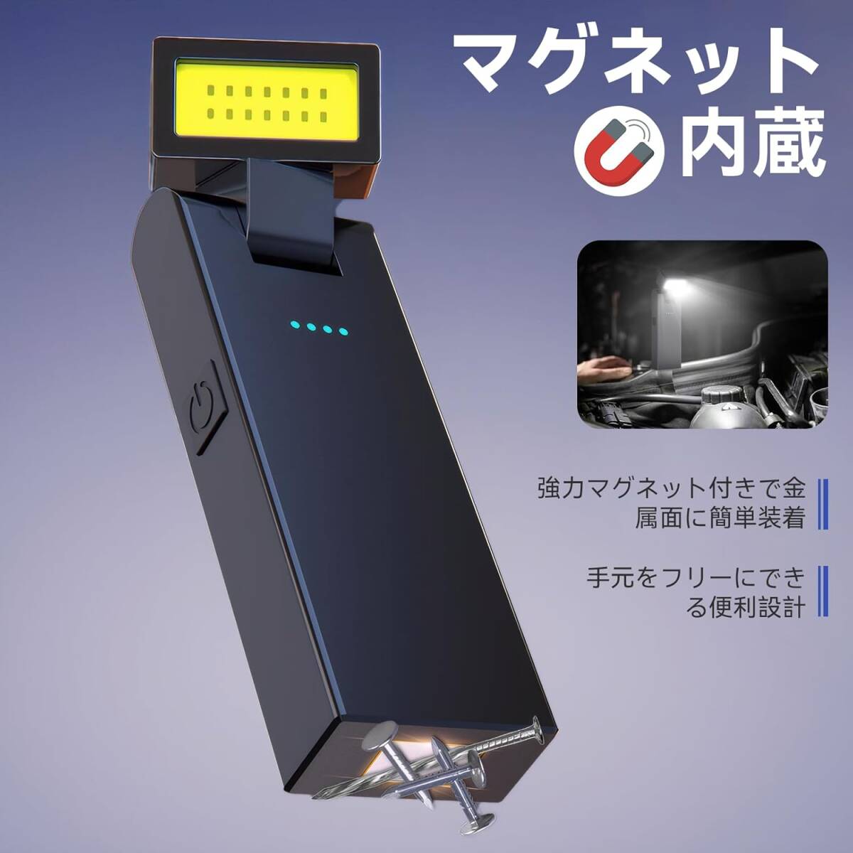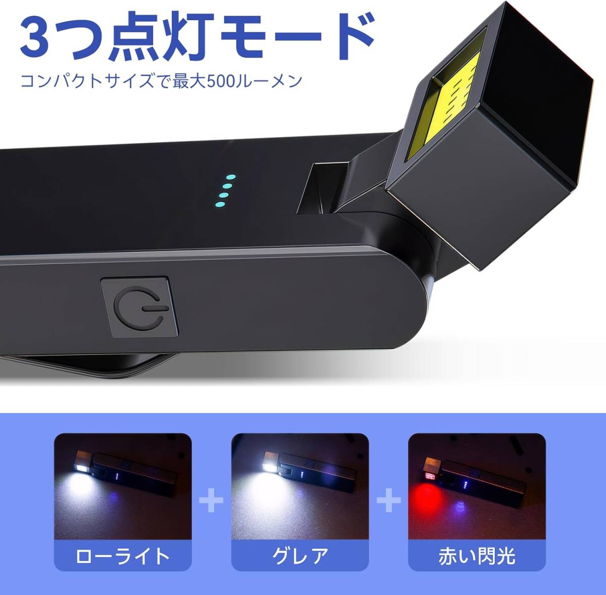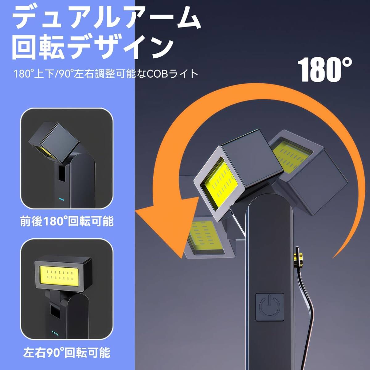 【180°上下/90°左右調整可能なCOBライト】 このCOBライトは革新的なデュアルアーム回転デザインを採用しており、ライトヘッドは180°上下に調節可能、メインライト部分も90°左右に回転するため多方向からの照明調整が可能です。ベッドで読書する時、キャンプで吊り下げて使う時、デスクワークの補助光として使う時など、様々な場面でぴったりの照射角度を簡単に設定できます。軽量コンパクトなボディデザインなので持ち運びに便利で、カバンに入れて外出先にも手軽に持っていけます。家庭用として、アウトドア用として、緊急時用としてなど、多様なシチュエーションで活用いただけます。