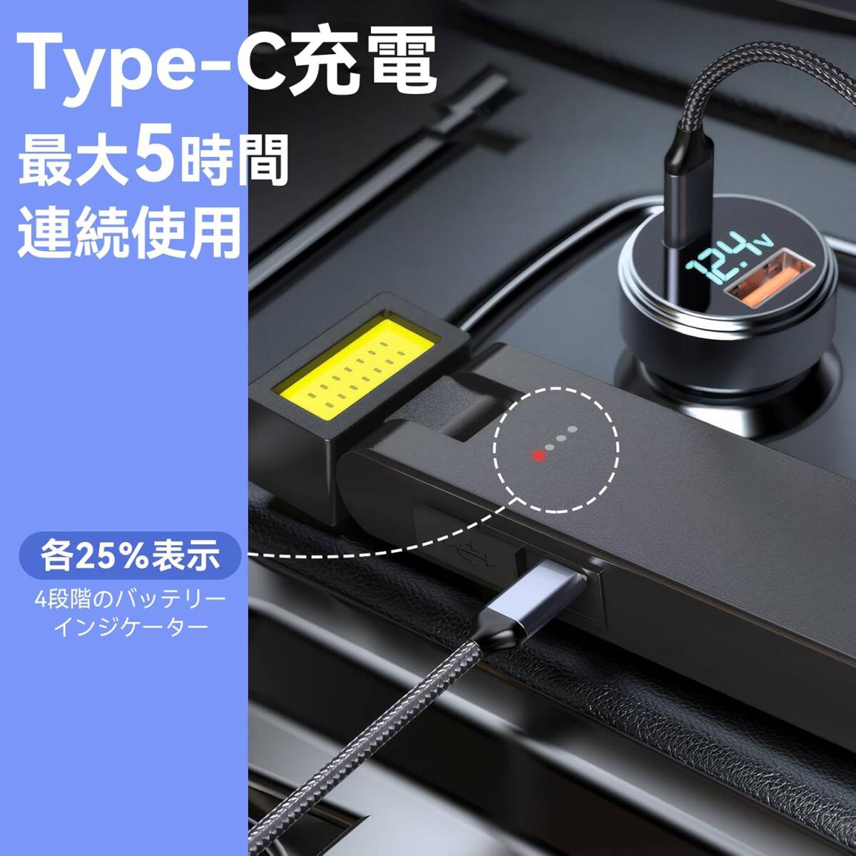 【Type-C充電&バッテリー表示】 Type-C充電ポートを採用した充電式ライトで、素早く効率的な充電が可能です。大容量バッテリーを内蔵しているため、明るい光を最大5時間持続させることができます。忙しい毎日でも安心してご利用いただけます。4段階のバッテリーインジケーター(各25%表示)で簡単に残量を確認可能なので、突然の充電切れを心配する必要がありません。