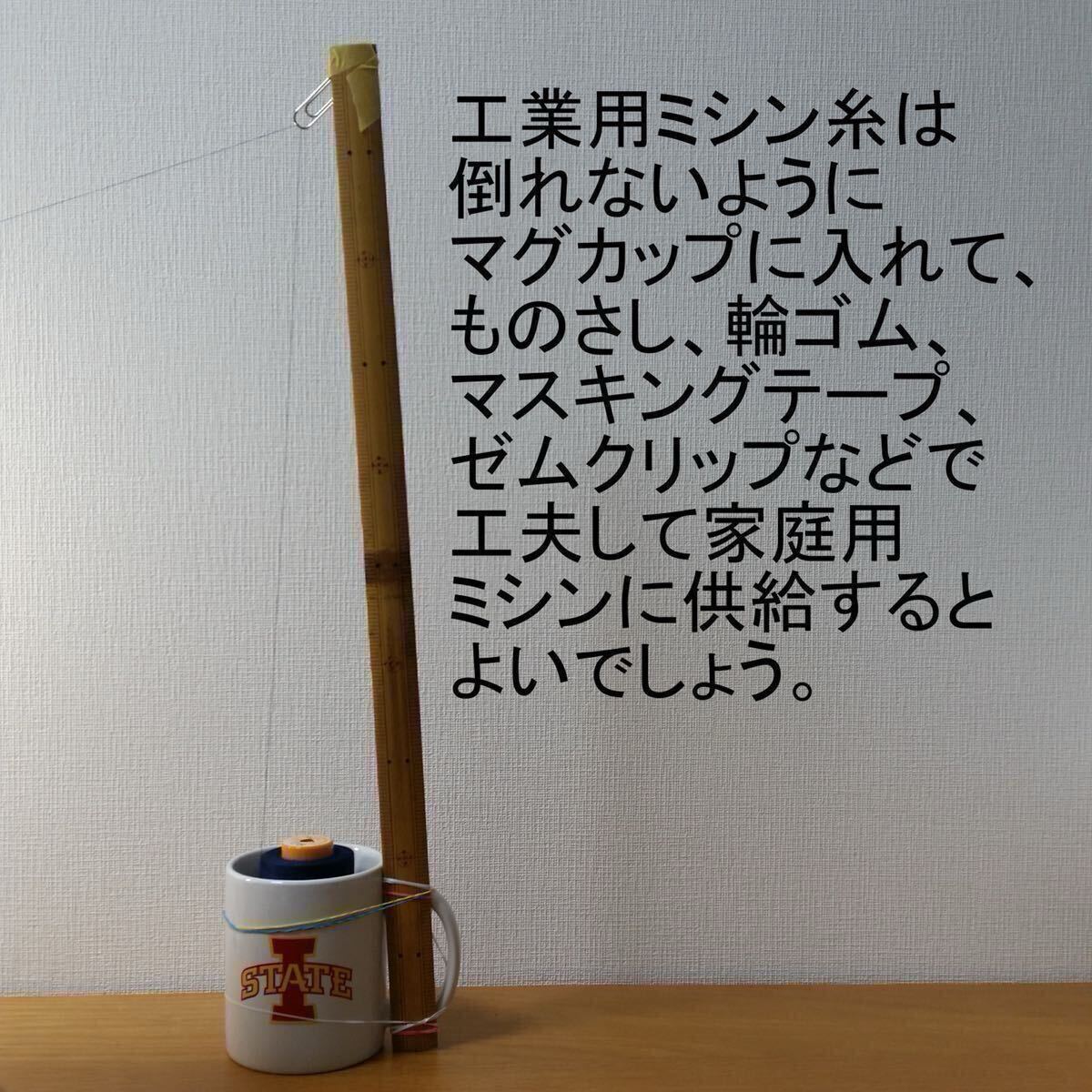 ○工業用ミシン糸をロックミシンに取り付けたり陶器製のマグカップに入れたりして固定して糸を供給してください