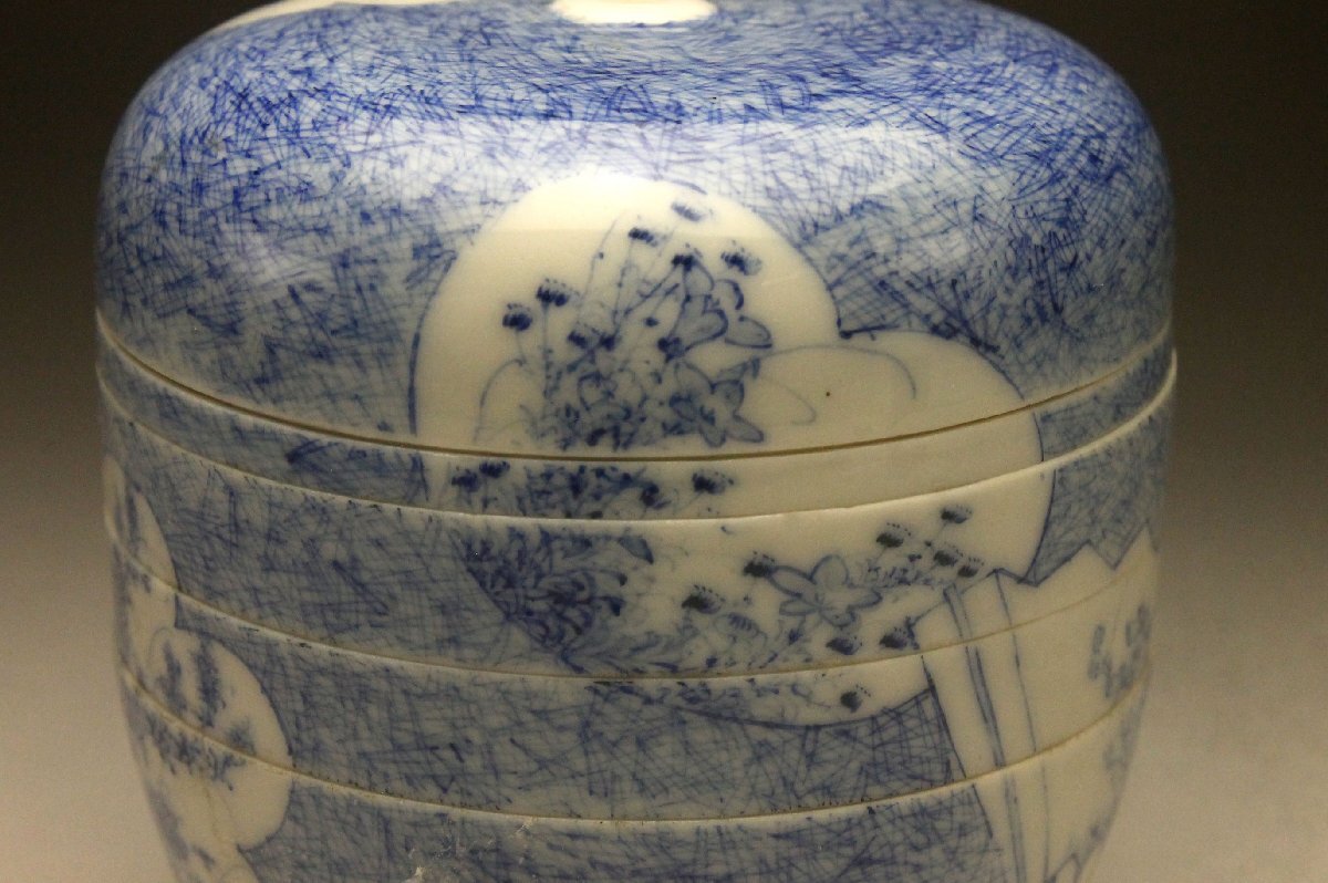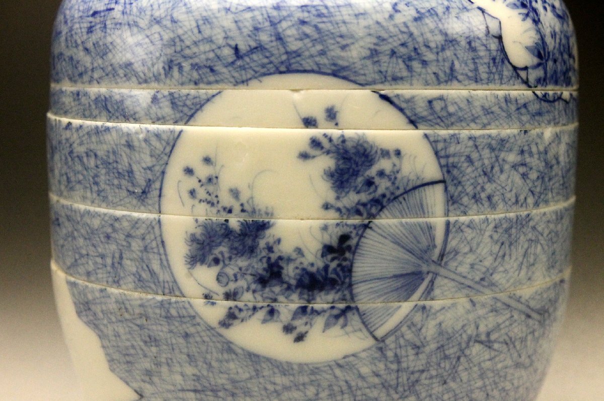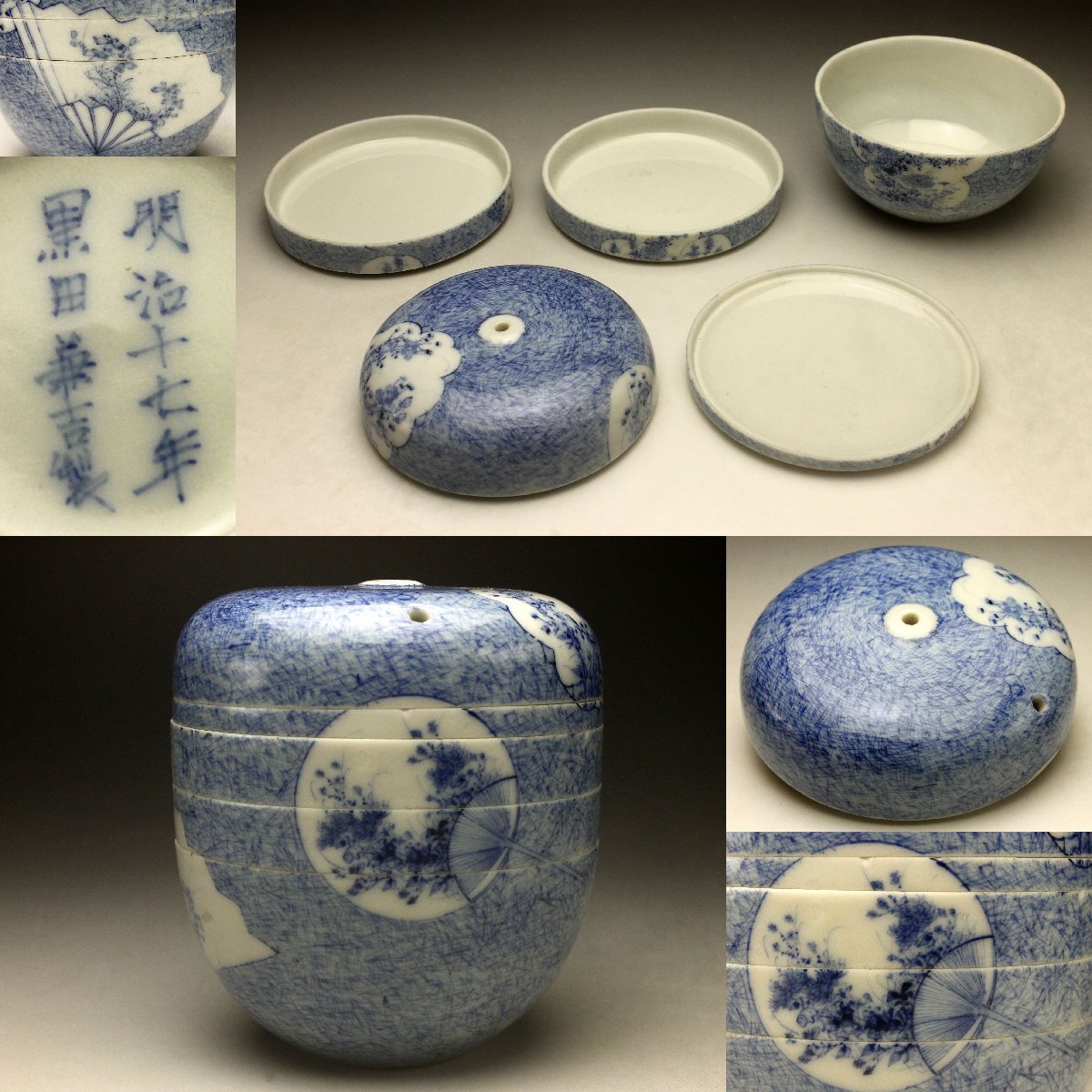 【余韻】明治十七年黒田兼吉製 瀬戸重 細密な染付 窓絵文 五段重箱 徳利付★木箱入 <同梱可>