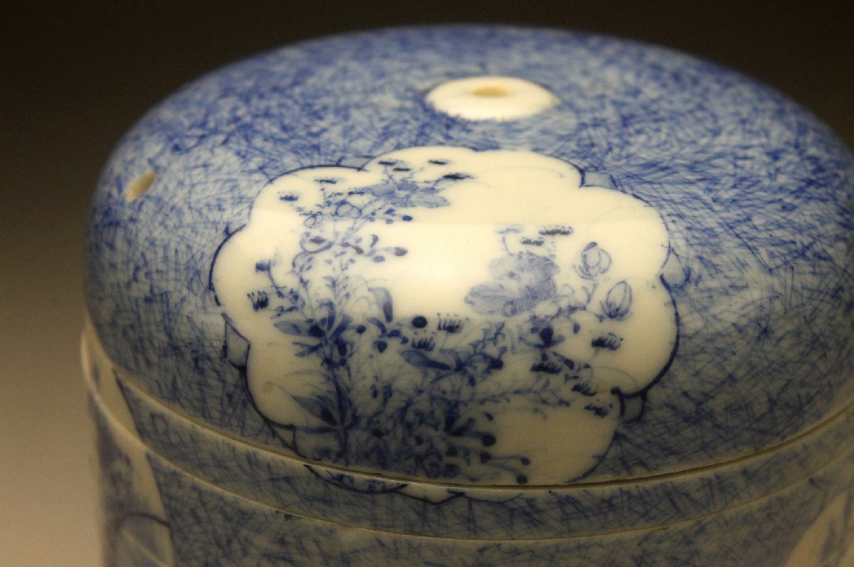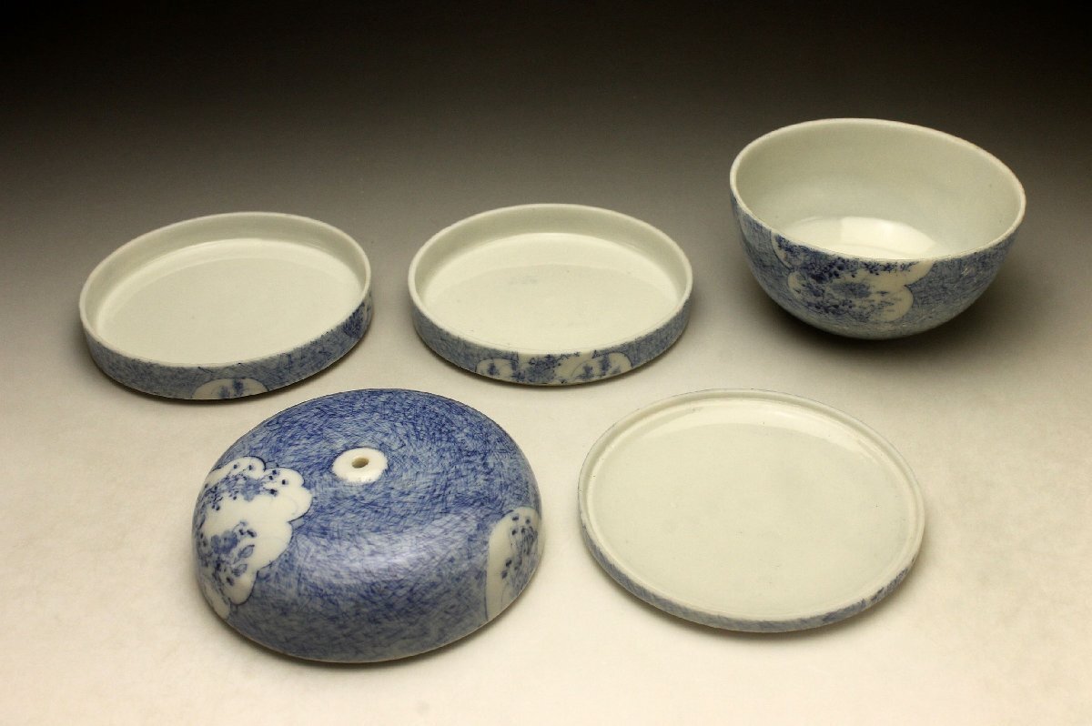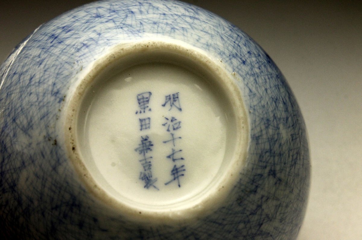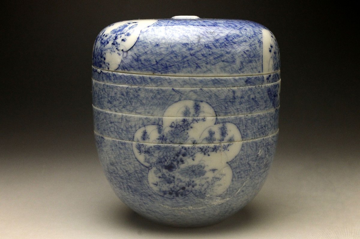 【余韻】明治十七年黒田兼吉製 瀬戸重 細密な染付 窓絵文 五段重箱 徳利付★木箱入 <同梱可>