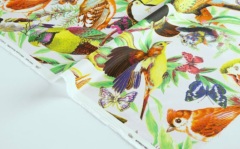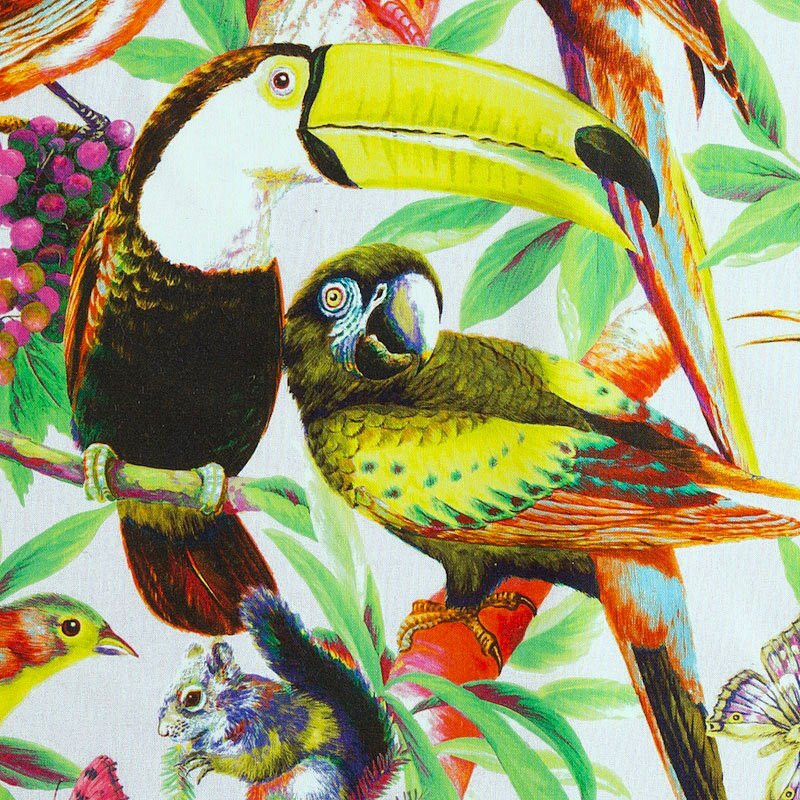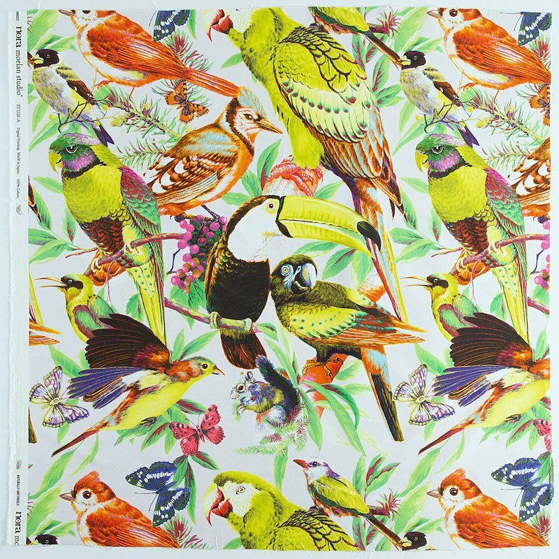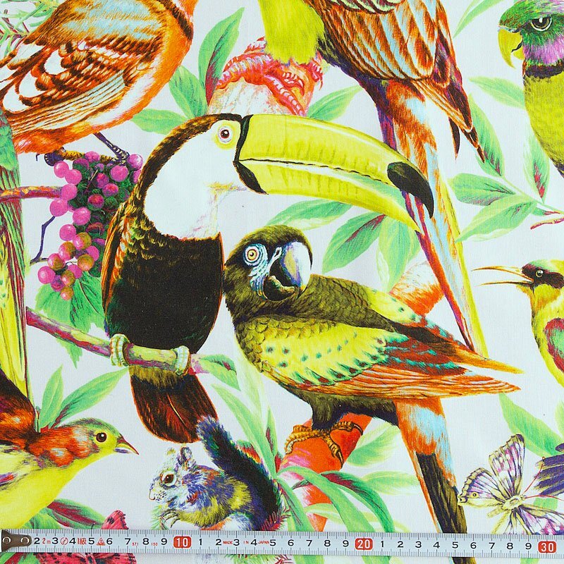 オウム、インコ、小鳥、リス、蝶々、小枝、実のついた植物をデジタル・プリントらしく、大胆でハッキリ、くっきりした色柄で表現しています。