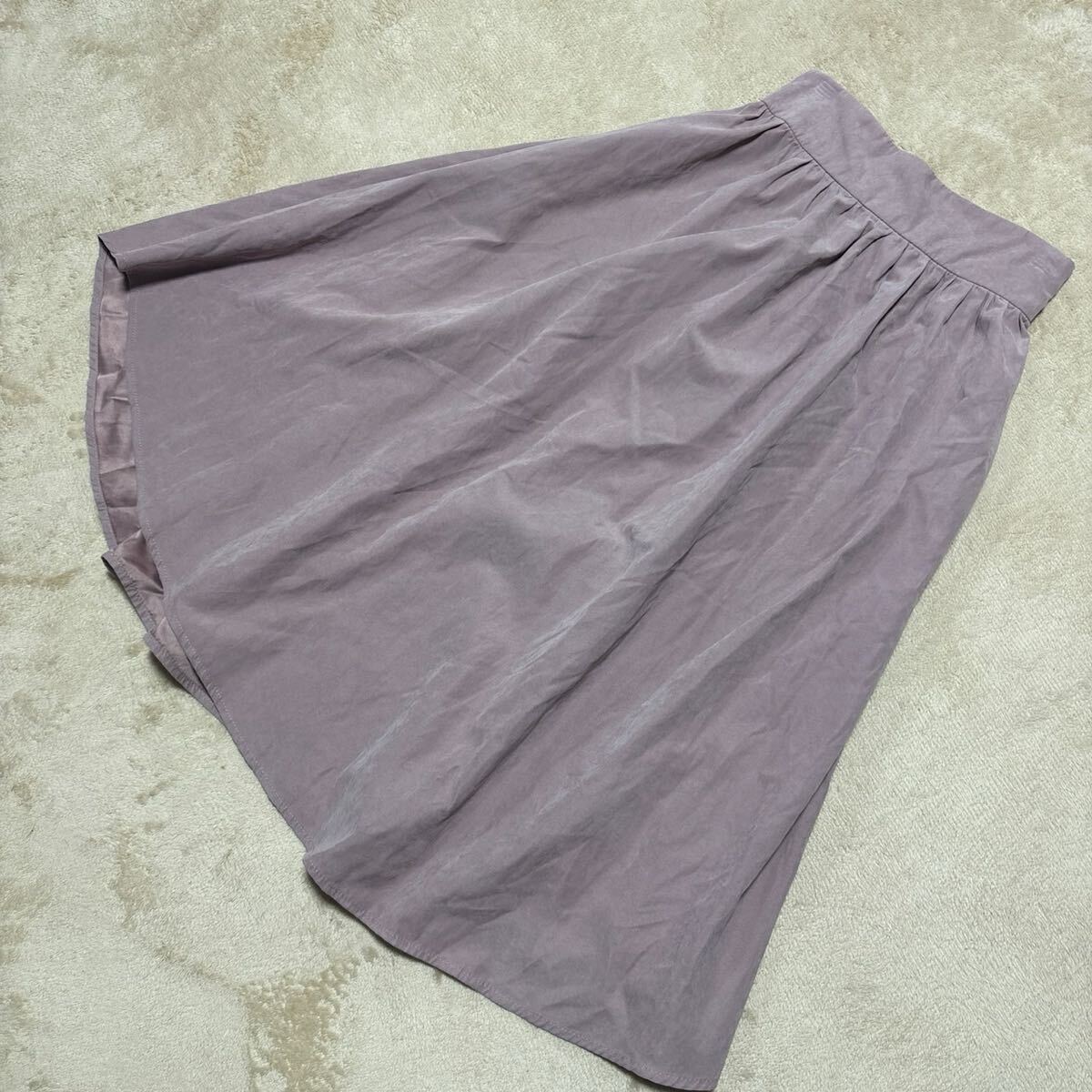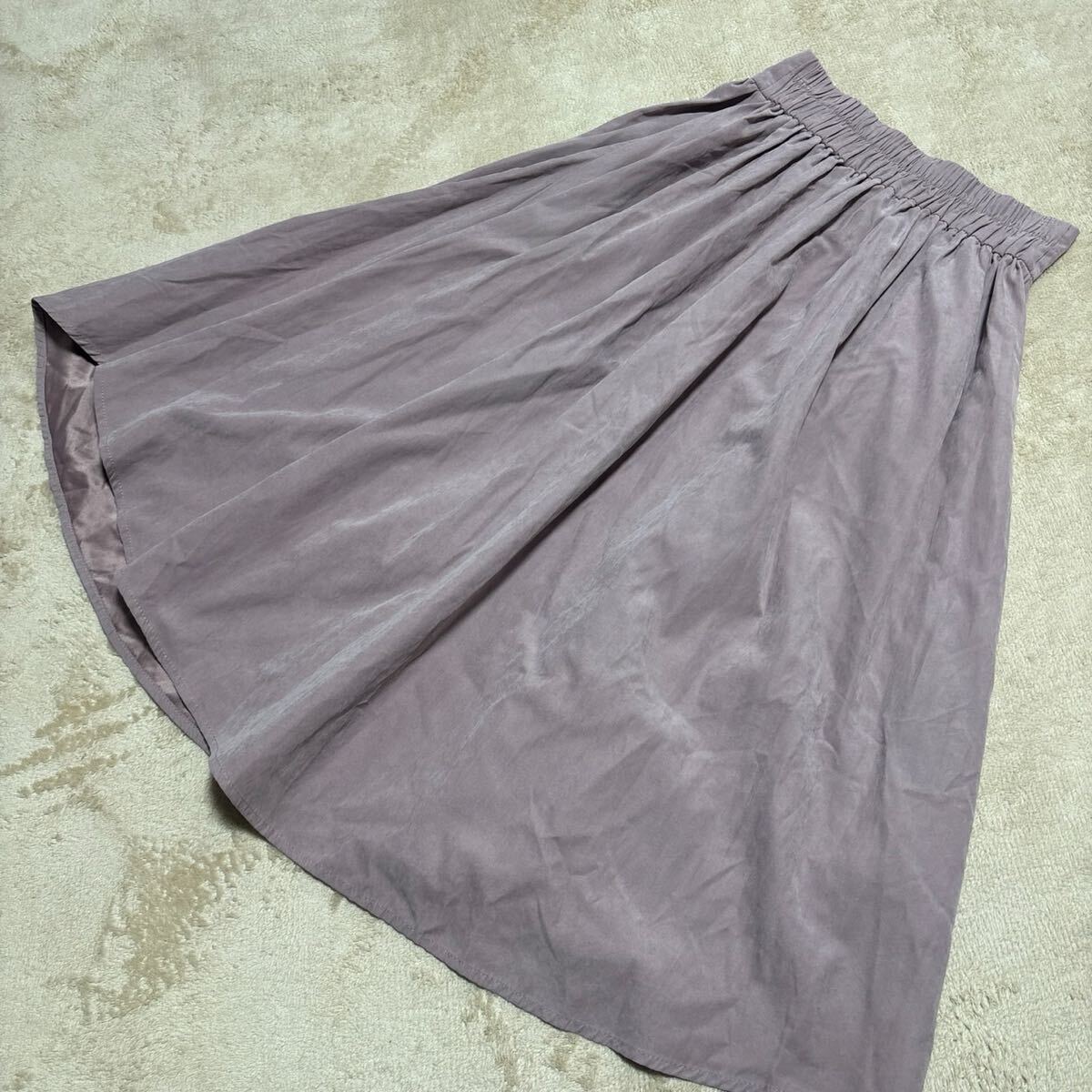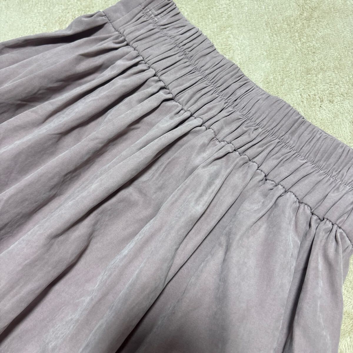薄紫のフレアスカート、ゴムウエストで快適な着心地。
