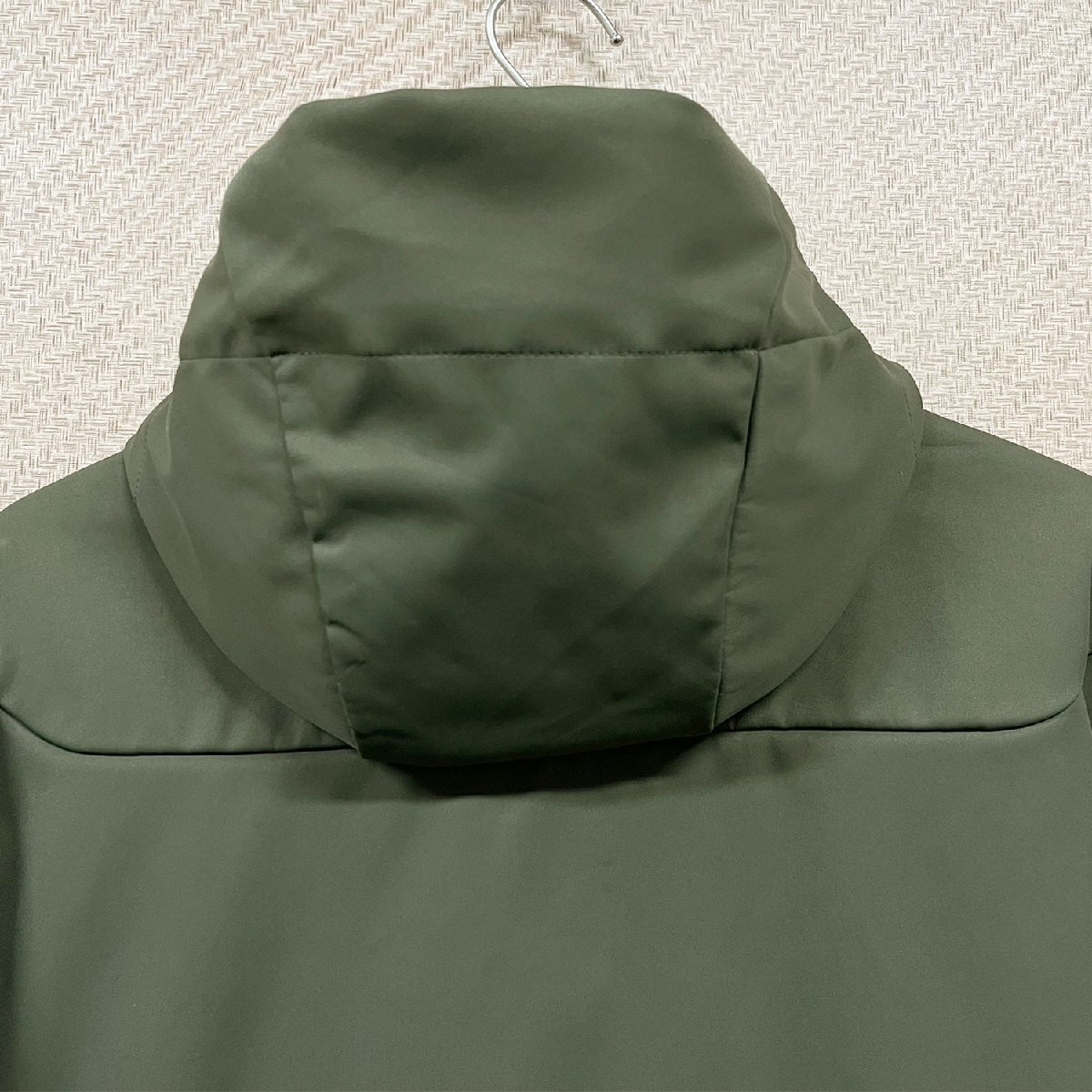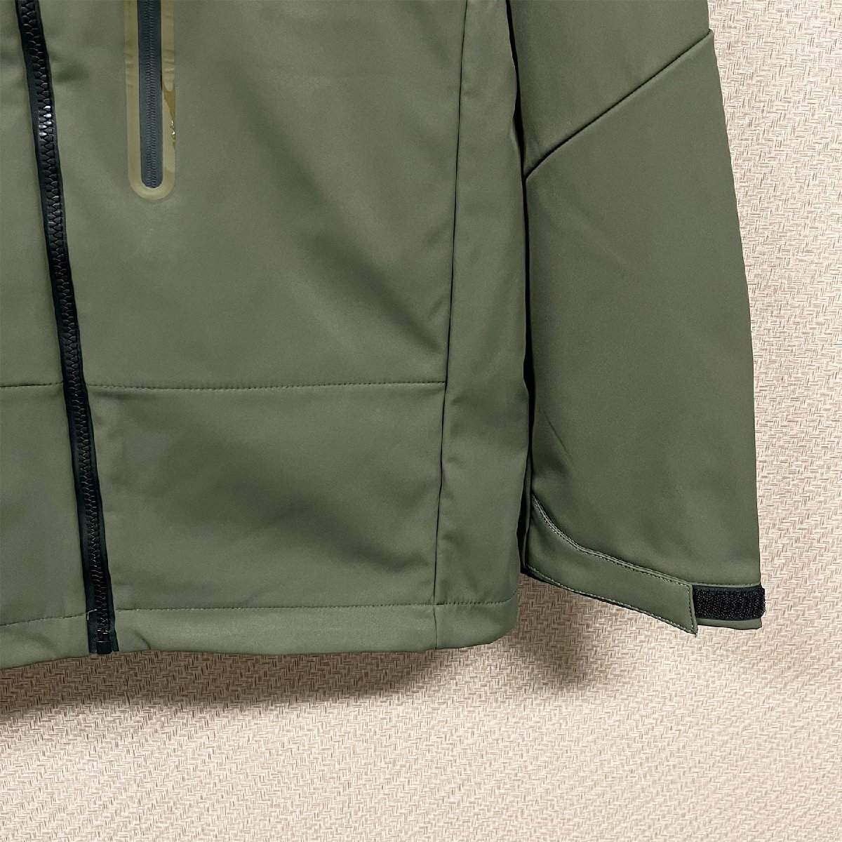 胸元には縦に配された2つのジップポケットを備え、デザインのアクセントにもなっています。袖部分にはファスナーの装飾を施し、シンプルながらも細部にこだわりを感じさせる仕上がりに。袖口はマジックテープで調整が可能で、フィット感を高めつつ風の侵入も防止。フードにはドローコードが付き、気候やシーンに応じて自由に調整できます。シルエットはベーシックで着回しやすく、誰にでも合わせやすい万能なデザインです。