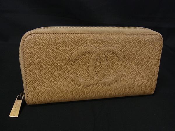 1円 CHANEL シャネル ココマーク キャビアスキン ラウンドファスナー 長財布 ウォレット 札入れ 小銭入れ ライトブラウン系 FP4517
