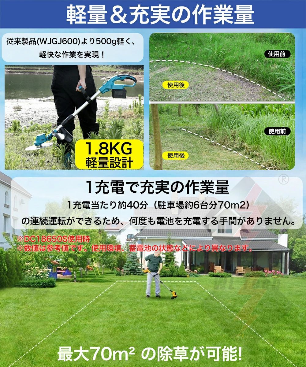 ◆大容量のバッテリー搭載& スマート管理機能 この電動草刈り機は、大容量のバッテリーを搭載しており、フル充電で1.5時間利用可能。