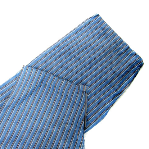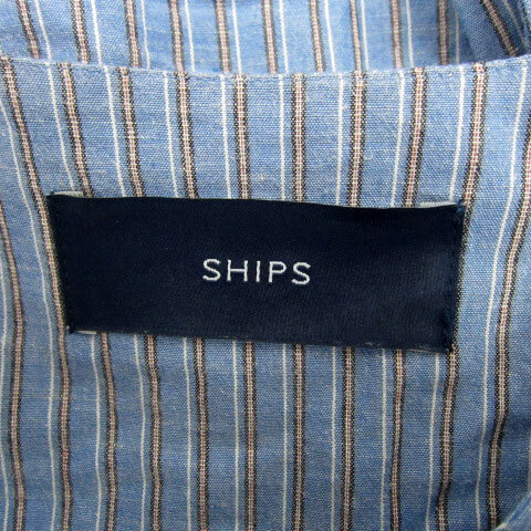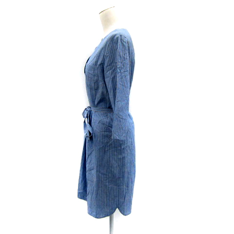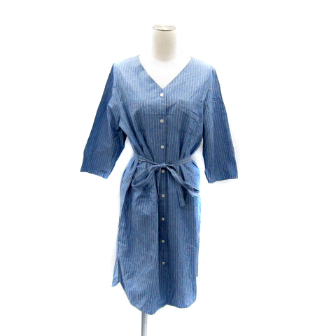 シップス SHIPS ワンピース ひざ丈 七分袖 Vネック ストライプ柄 リボン リネン混 青 ブルー /SY14 レディース