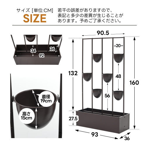 • ◎03 しっかりと取り付けられた植木鉢で安定性抜群上部には6つの植木鉢を備え、それぞれフレームにしっかりと取り付けられているため、重量が均等に分散され、植物が偏って成長しても倒れにくく、優れた安定性を実現します。強風でも落下の心配はありません。巧妙なはめ込み構造デザイン植木鉢を簡単に取り外せる設計で、清掃も非常に簡単です。植木鉢のサイズ 直径19cm 高さ15cm 植木鉢の耐荷重5KG 下部のプランター深型設計(27.5cm)で根がしっかり育つ深さ27.5cmの設計で、植物の根がしっかり広がり、健康的に育てられます。プランターの内寸:88*38*27.5cm耐荷重:20kg