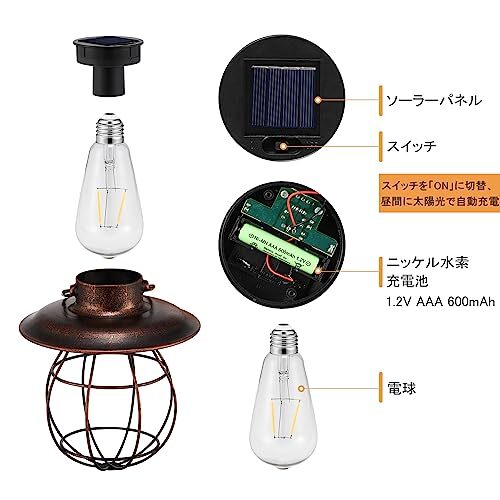 商品説明 | 【暖色ランタン・癒し】暖かくて柔らかい灯りは落ち着いたリラックスできる安全な空間を演出、疲れた体と心を癒してくれます。点灯しないときにも飾り物としても雰囲気十分!(ご注意:本製品は飾るために設計されているので、明るさはあまり高くありません。予めご了承ください。) 【電気代0・防水】家計にも環境にも優しいソーラー充電式、電気代ゼロ、排気ガスゼロ。国際IP44防水機能を備えており、雨の日でも安心!(◆◆◆ソーラーランタンの寿命を延ばすため、台風や豪雨などの悪天候の場合は、室内に移動してください。) 【自動点灯・無線】スイッチを「on」にしてから、ソーラーパネルが日中に太陽光で充電し、暗くなったら自動点灯、明るくなったら自動消灯/充電。コンセントや電気配線もいらないので、どんな場所でも簡単に設置できます。(ご注意:ご充電は、スイッチを「ON」にする必要がございます。 スイッチが「OFF」の状態では充電されません。予めご了承ください。) 【アンティーク風設計・便利】昔懐かしい姿形でアンティーク調がそのまま醸し出せます。古材を使用した空間にぴったり。北欧インテリアやナチュラルテイストのインテリアにも似合います。ぶら下げて使うこともできるので、使いたい場所に吊り下げて便利。(ご注意:明暗センサー付きなので、日中や明るい場所でソーラーパネルが上向きになると、スイッチを「ON」にしても点灯しません。この場合、ソーラーパネルを下にしたり、手で覆ったりして再度「ON」にしてみてください。) 【幅広い場所適用・安心保証】ガーデン、玄関、ベランダ、通路などに雰囲気照明として大活躍。◆◆◆安心の2ヶ月保証付き、なにか不具合があれば、右にある販売元 「pearlstar -JP」 をクリックしてご連絡ください。必ず最善を尽くし、保証サービスをご対応いたします。