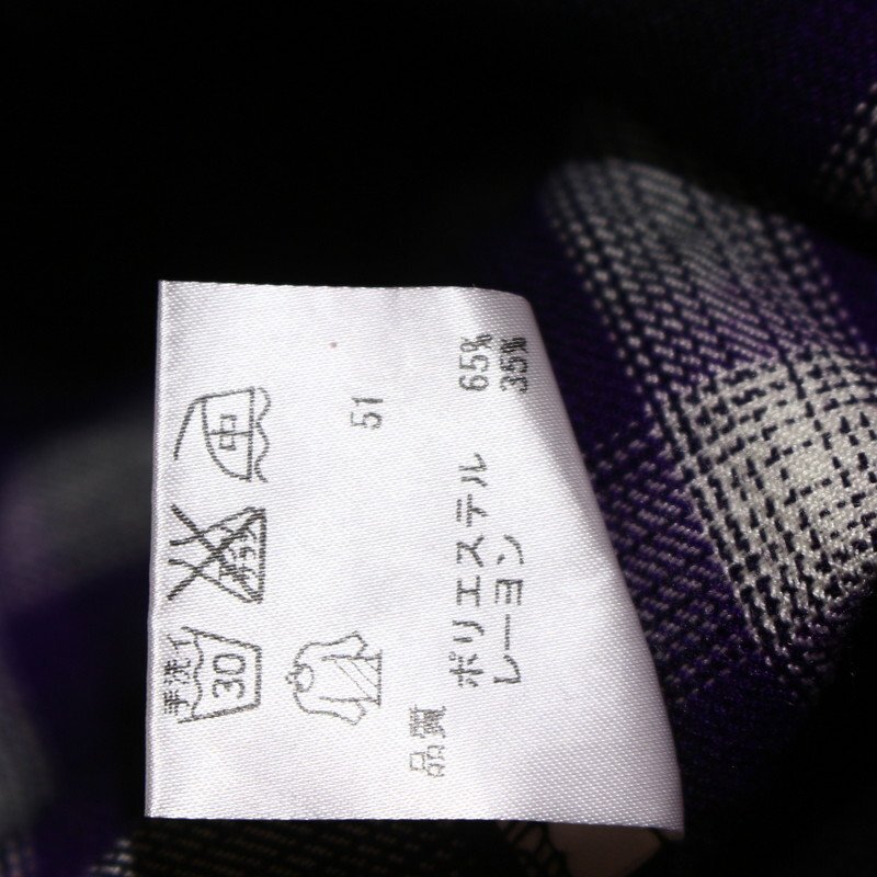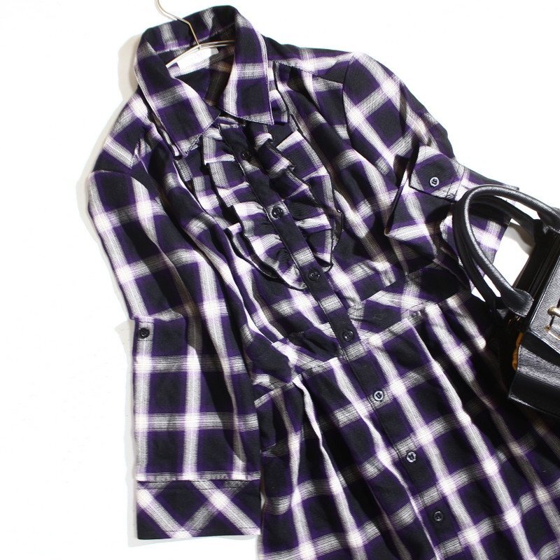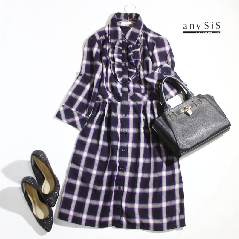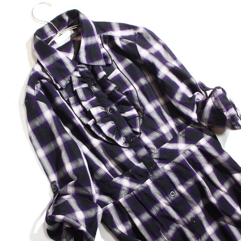 美品 エニィスィス any SiS 組曲 株)オンワード樫山 秋 冬 ネルチェック 長袖 フリルシャツワンピース 9号 2 パープル 紫 ブラック 黒 白