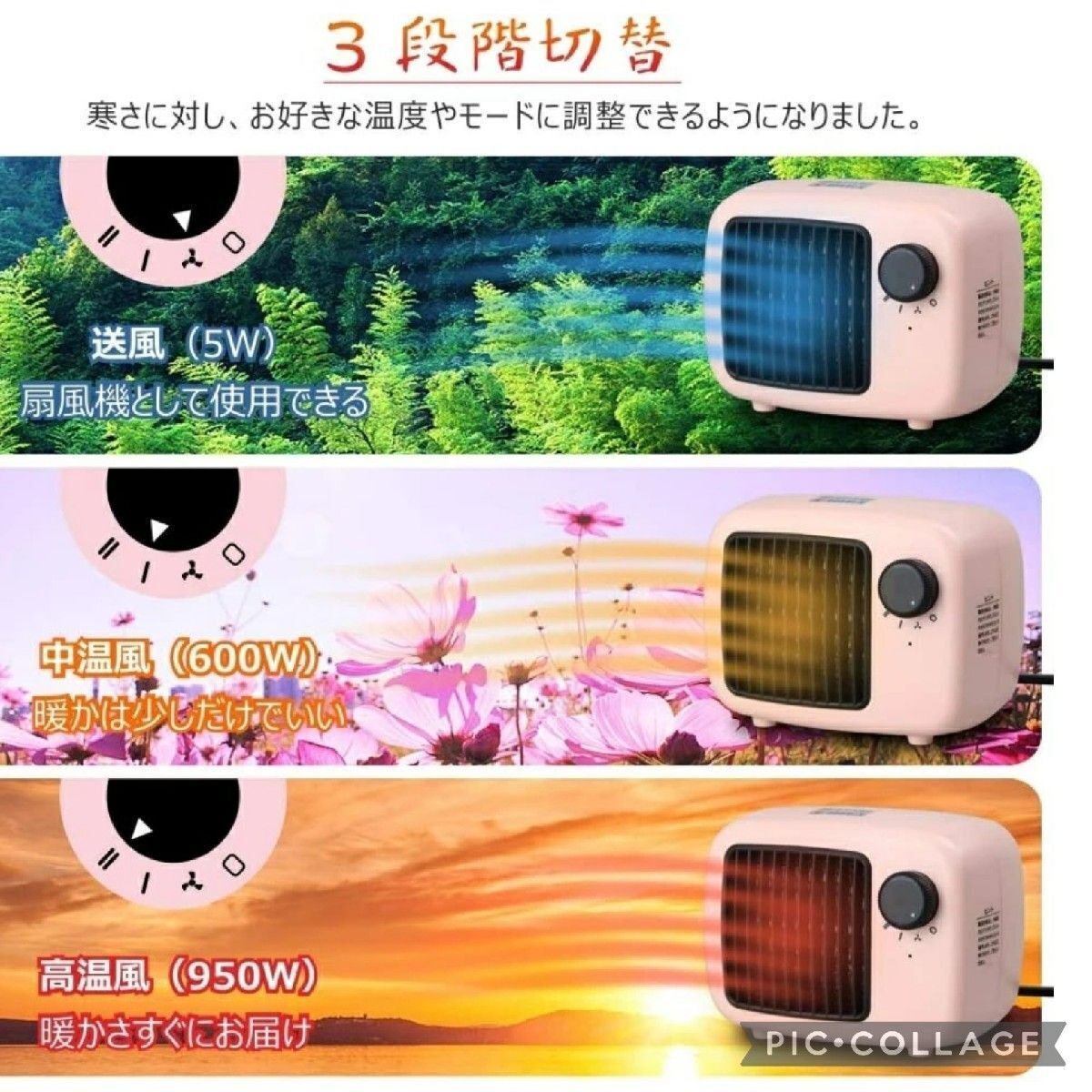 【3段階切替&暖房器具 省エネ】高温風(約900W)・中温風(約600W)・送風(約3W)の3段階出力モード。低消費電力、高効率、省エネ。お好きな温度に調整。ダイヤルスイッチ式。