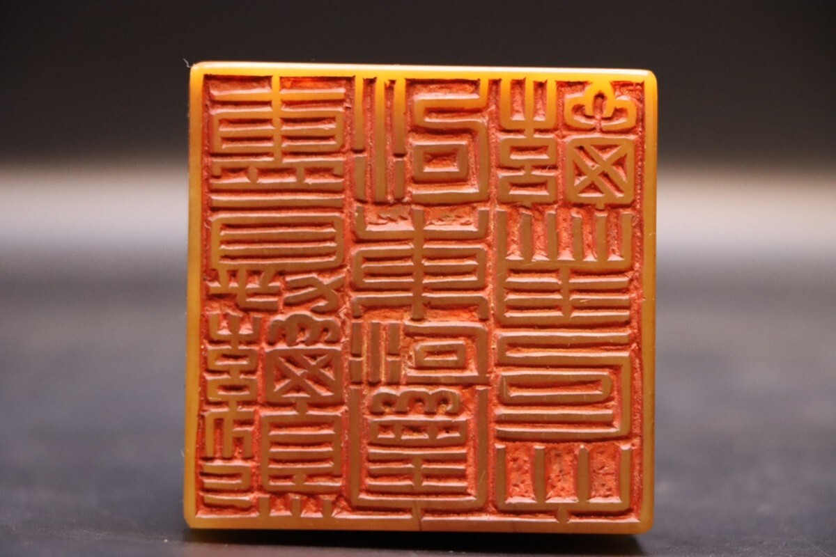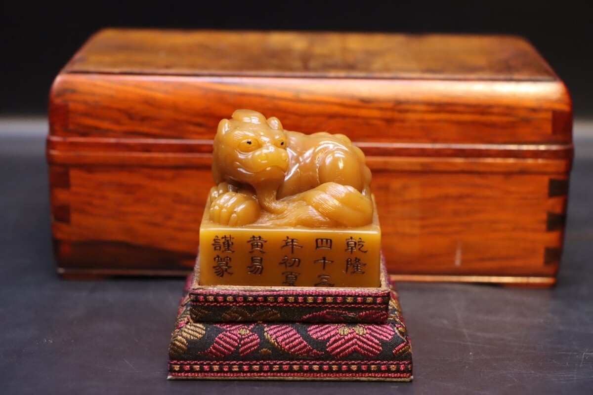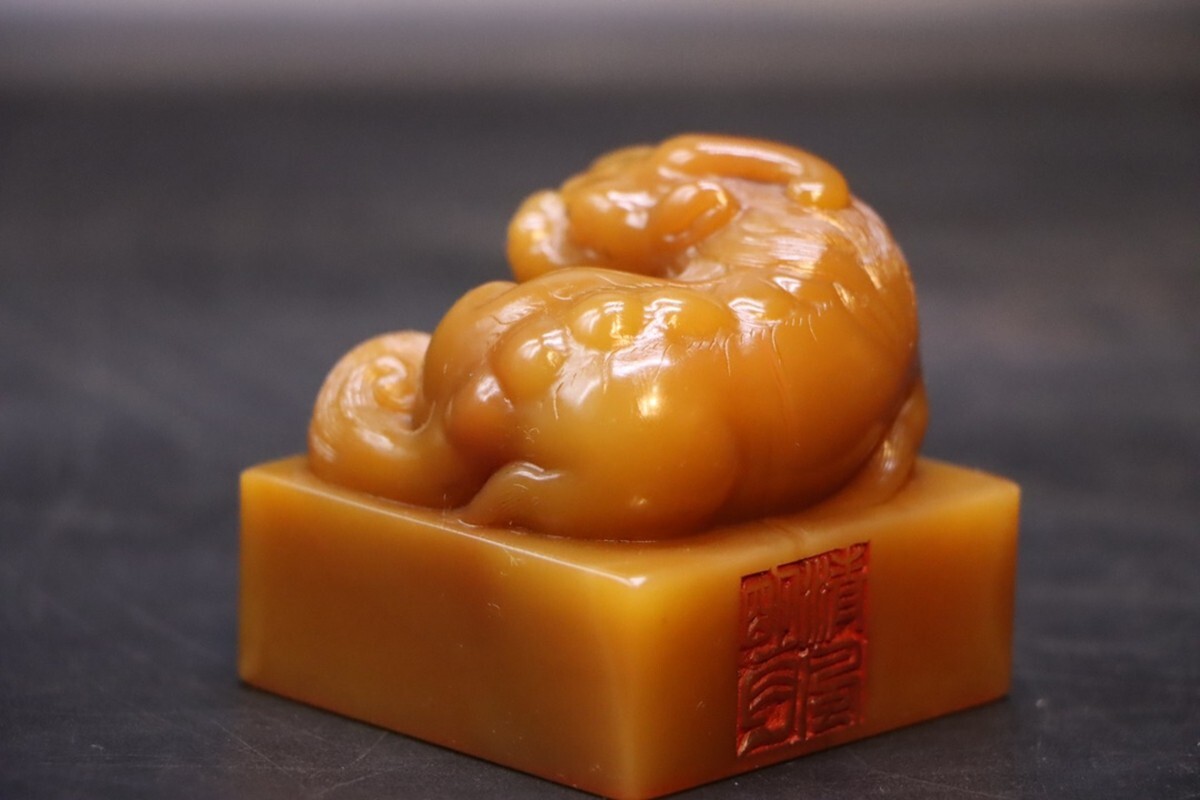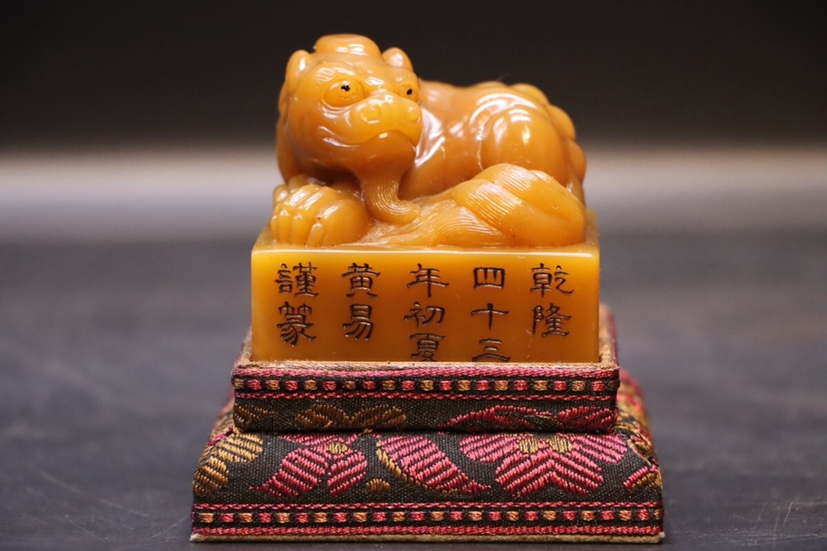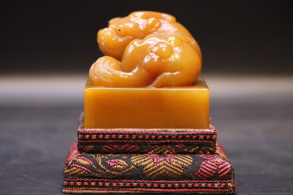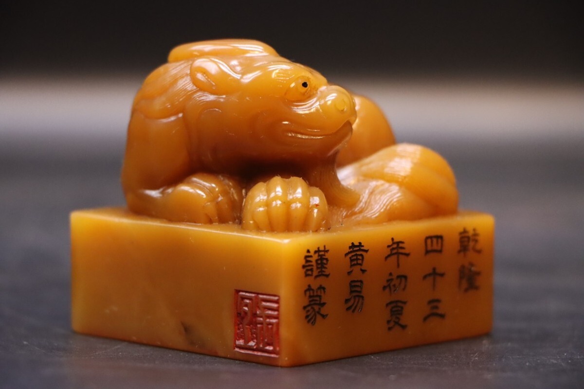 「清 黄易篆 老寿山石 田黄石彫り 獣鈕印章」極細工 擺件 古賞物 中国古美術 旧蔵出