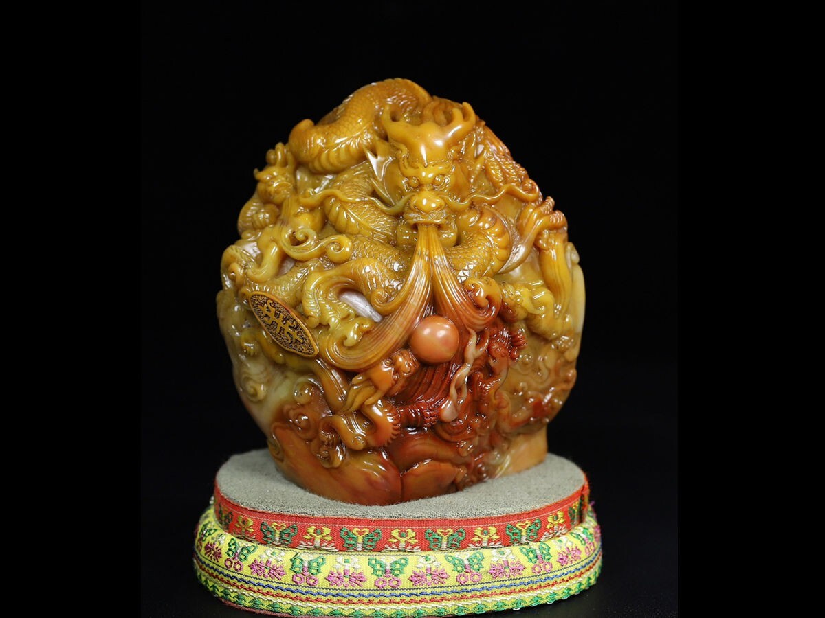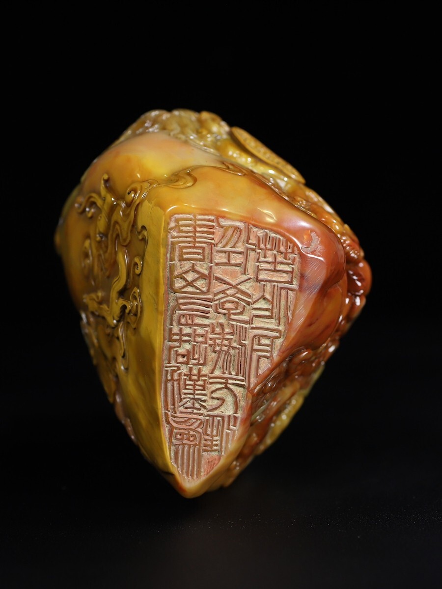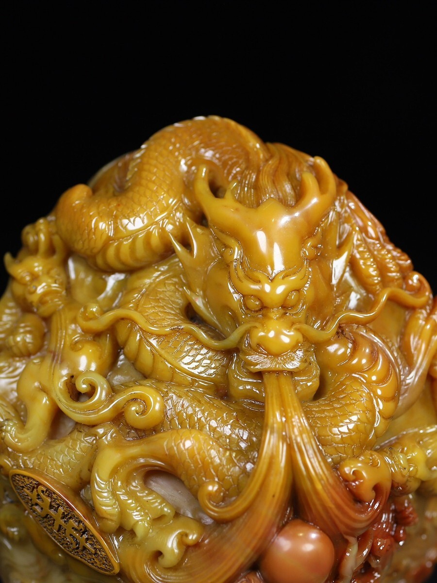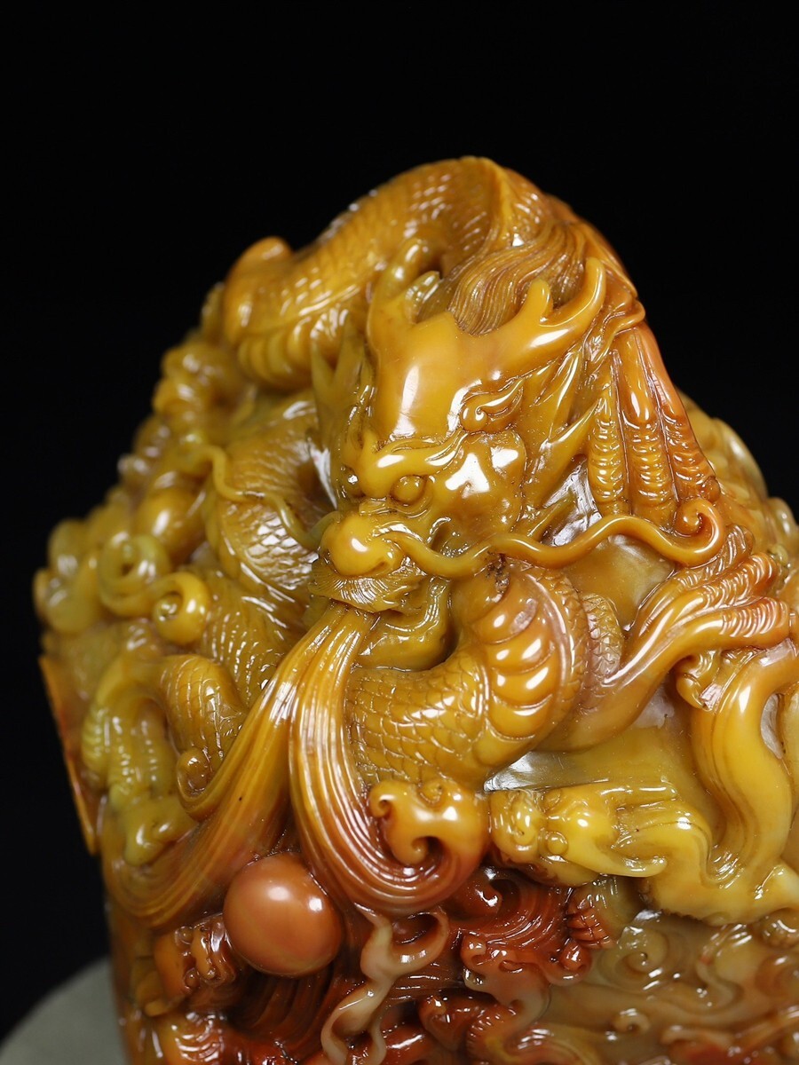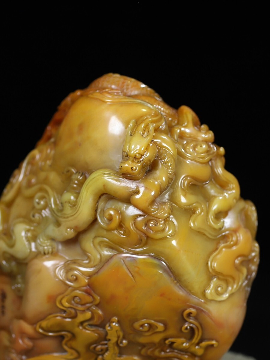 「清 呉俊 老寿山石 田黄石彫り 群龍戲珠 印章」極細工 擺件 古賞物 中国古美術 旧蔵出