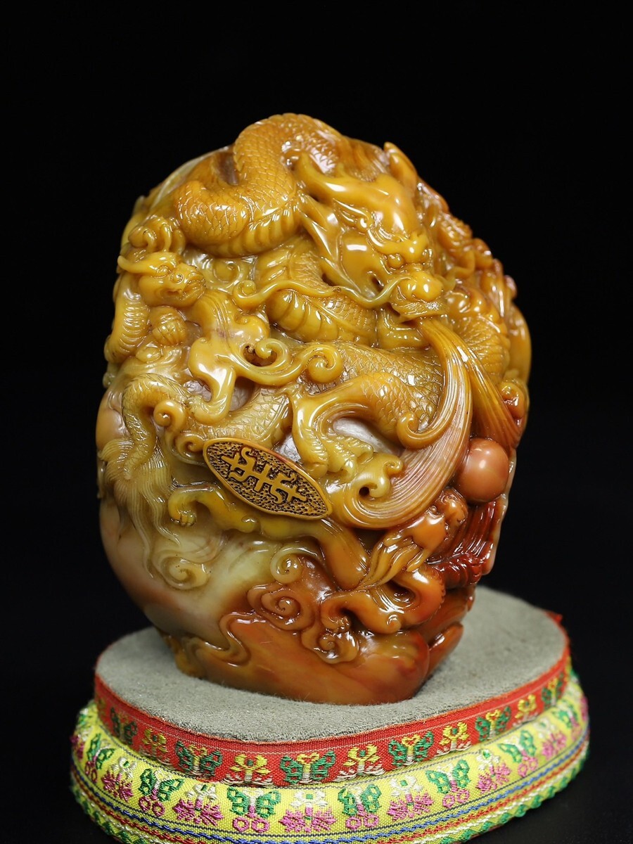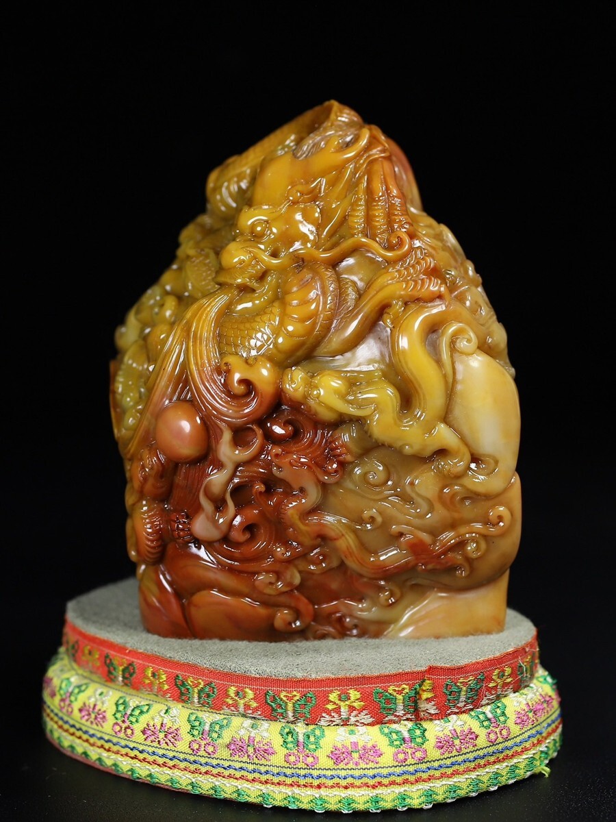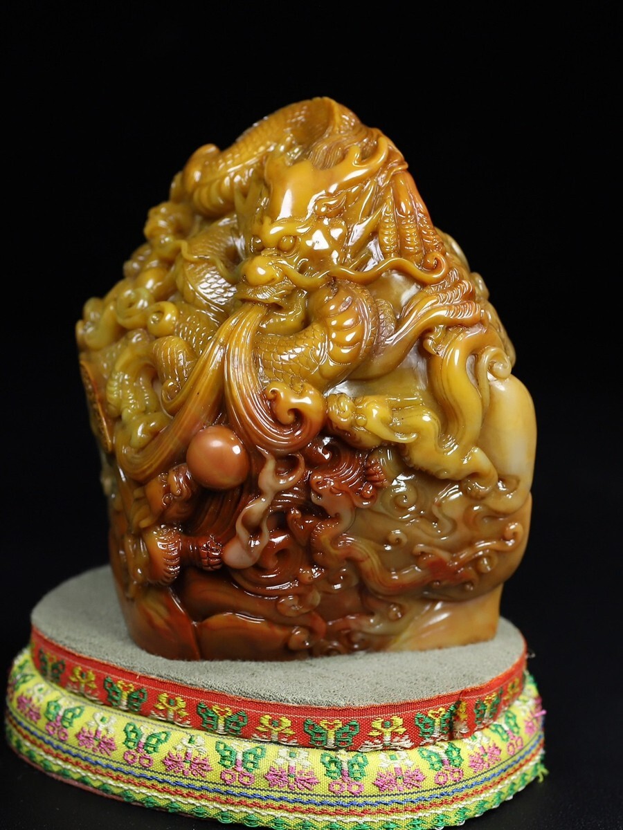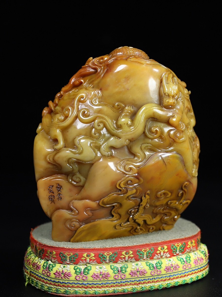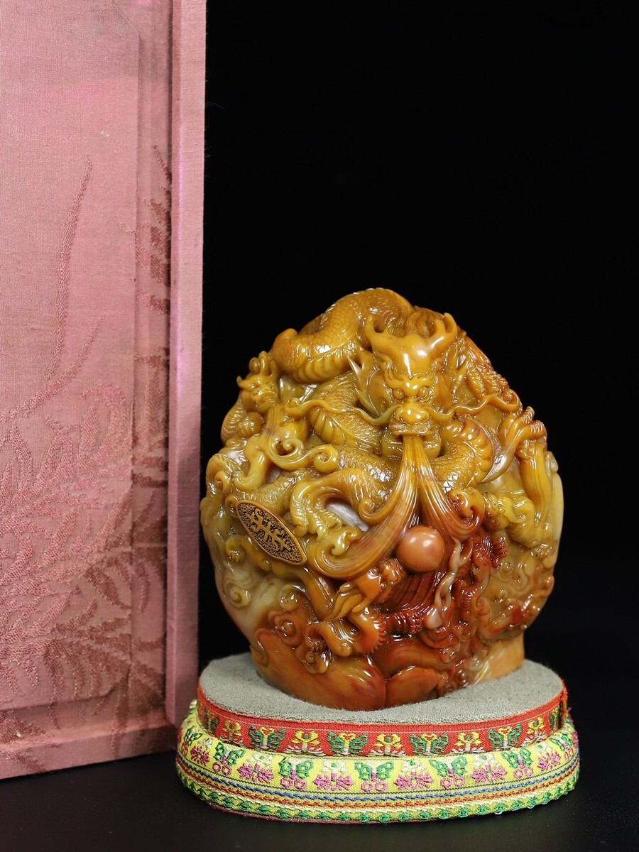 「清 呉俊 老寿山石 田黄石彫り 群龍戲珠 印章」極細工 擺件 古賞物 中国古美術 旧蔵出