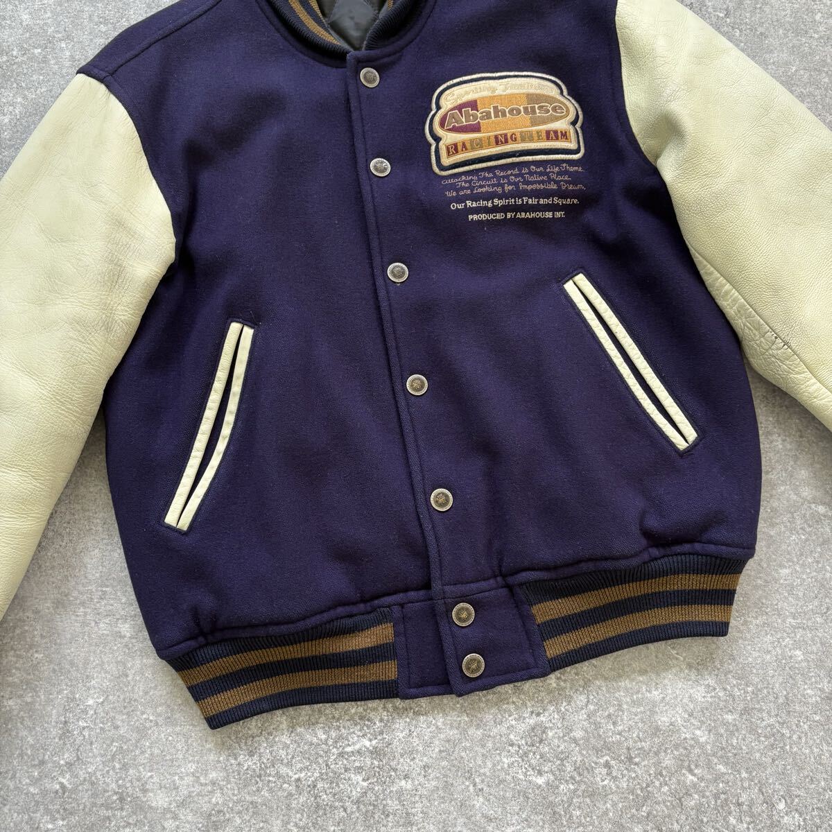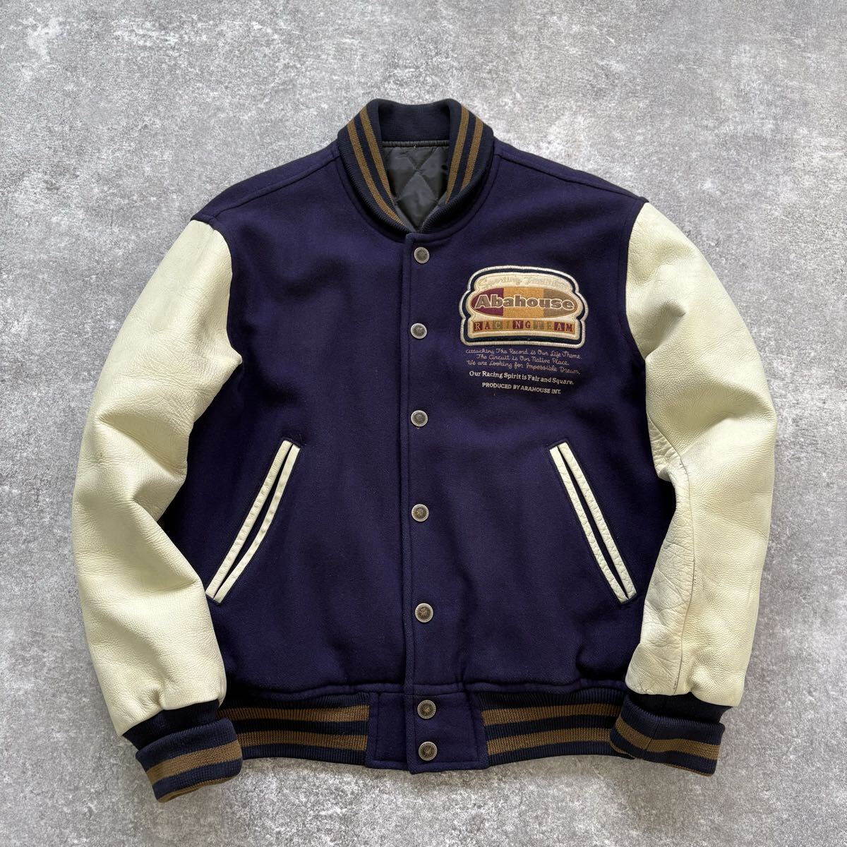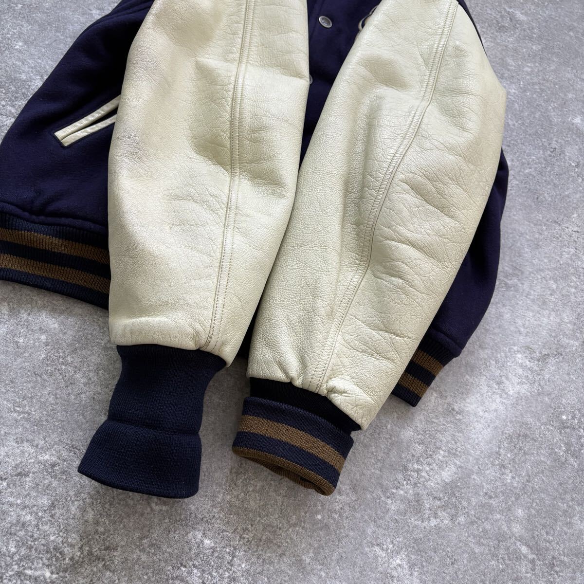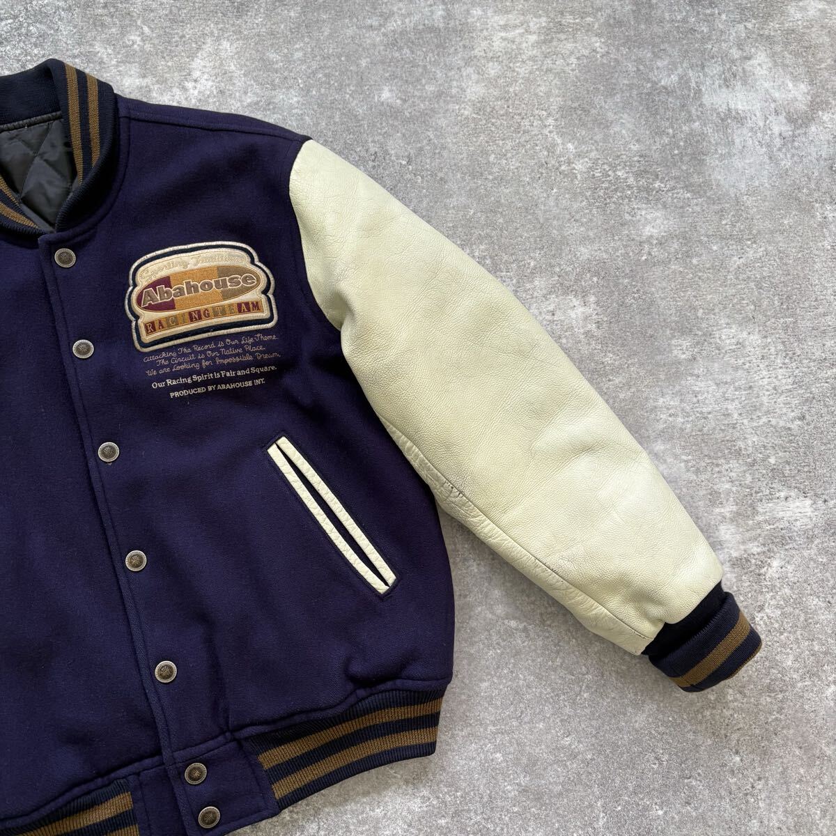 ウールボディにレザー袖を組み合わせた“ザ・スタジャン”のスタイルに、レースカルチャーを彷彿とさせるワッペン刺繍。