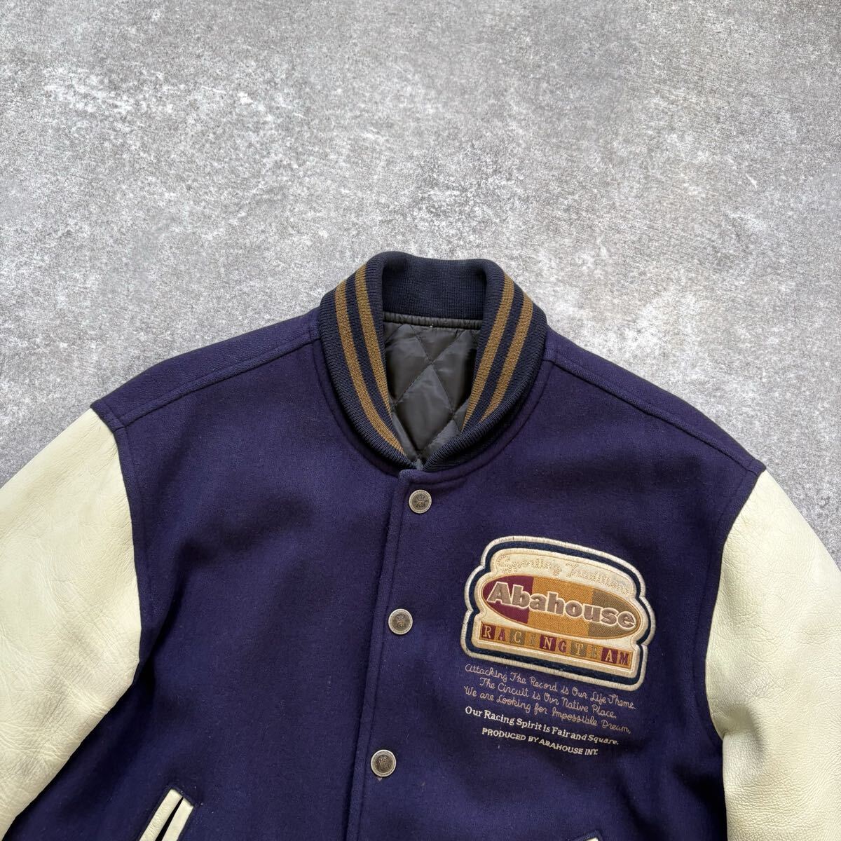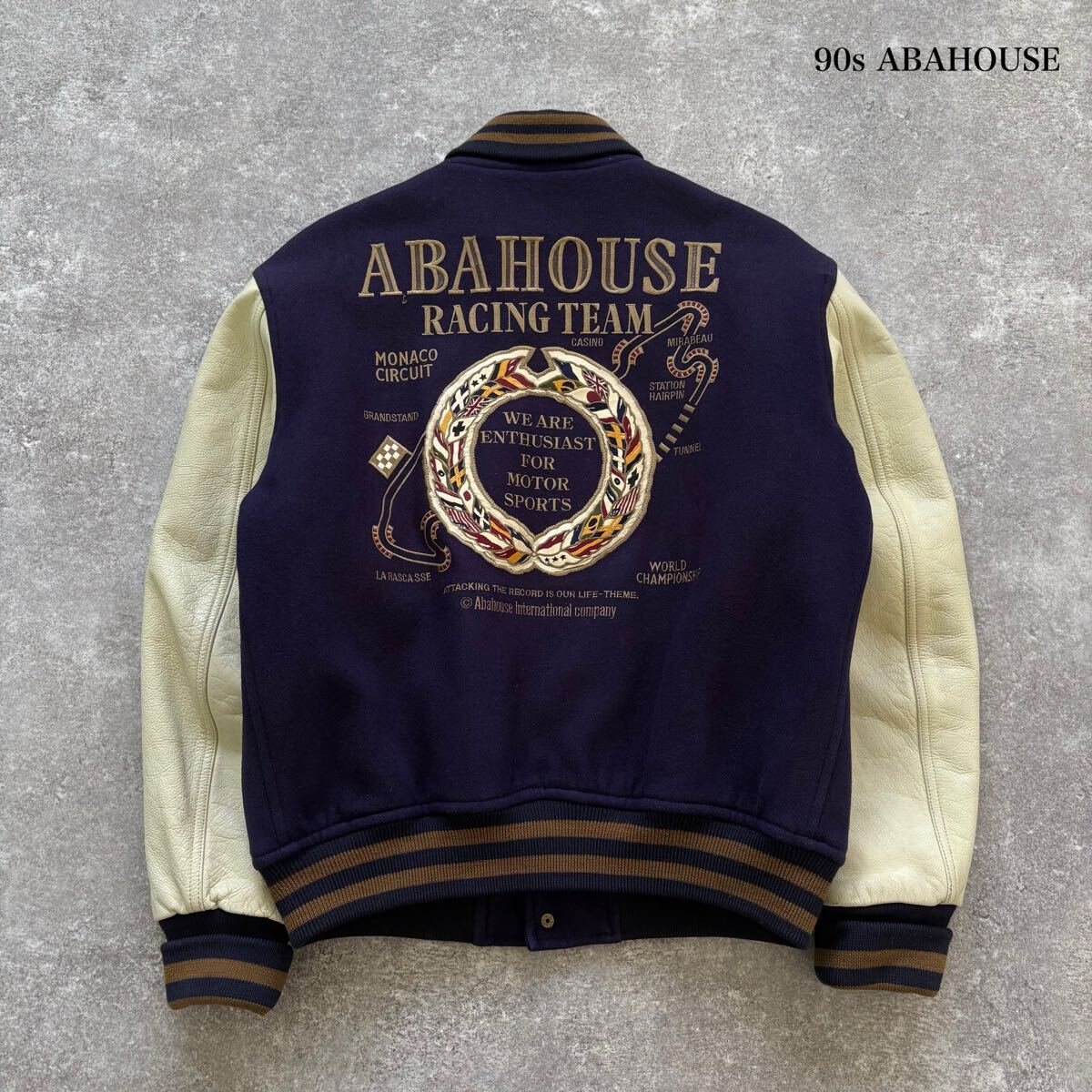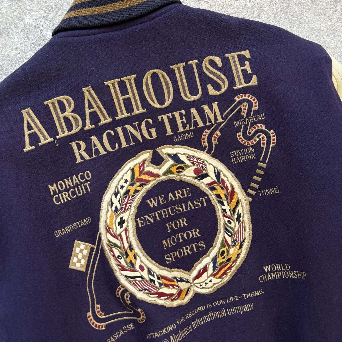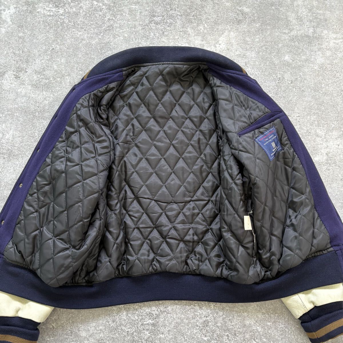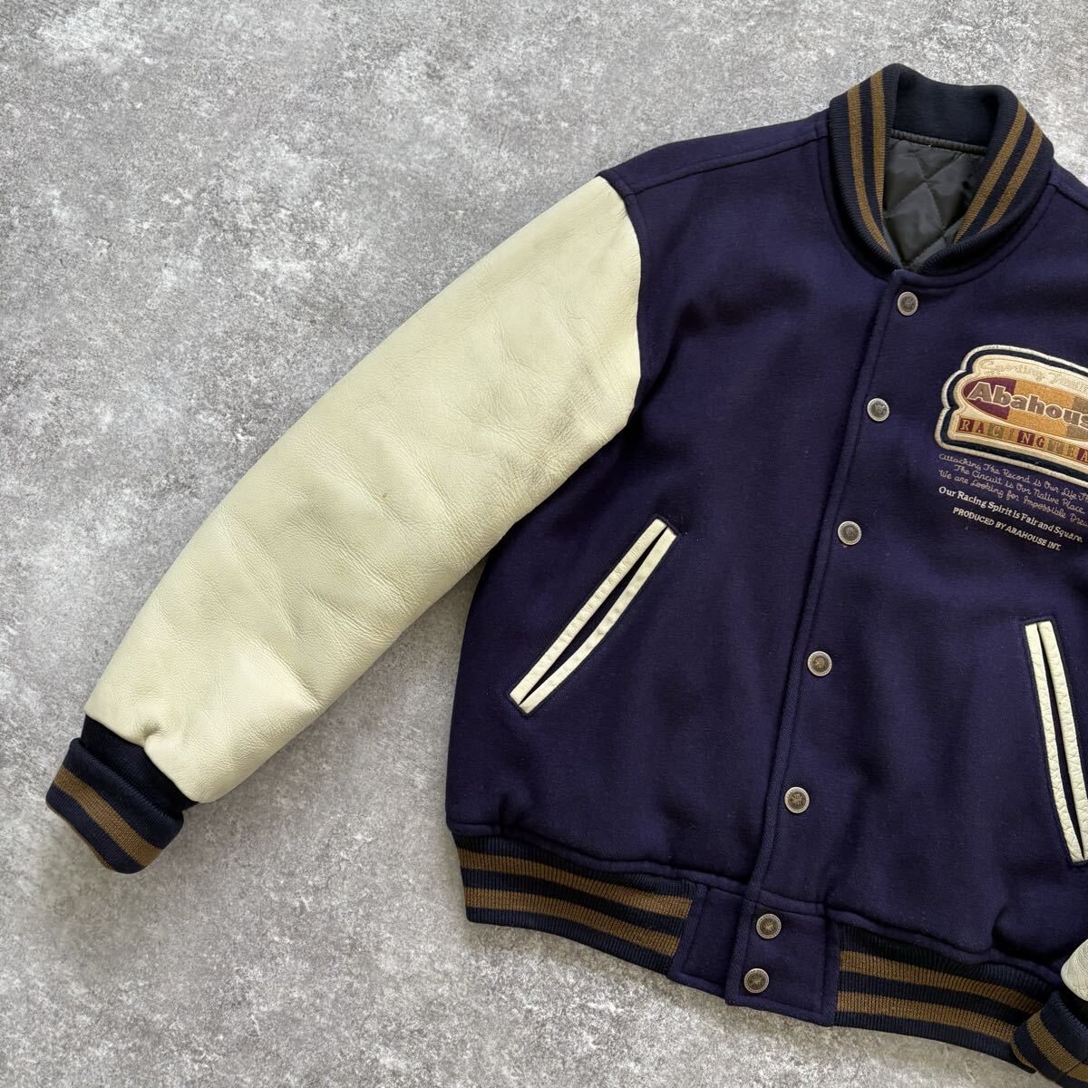 ウールボディにレザー袖を組み合わせた“ザ・スタジャン”のスタイルに、レースカルチャーを彷彿とさせるワッペン刺繍。