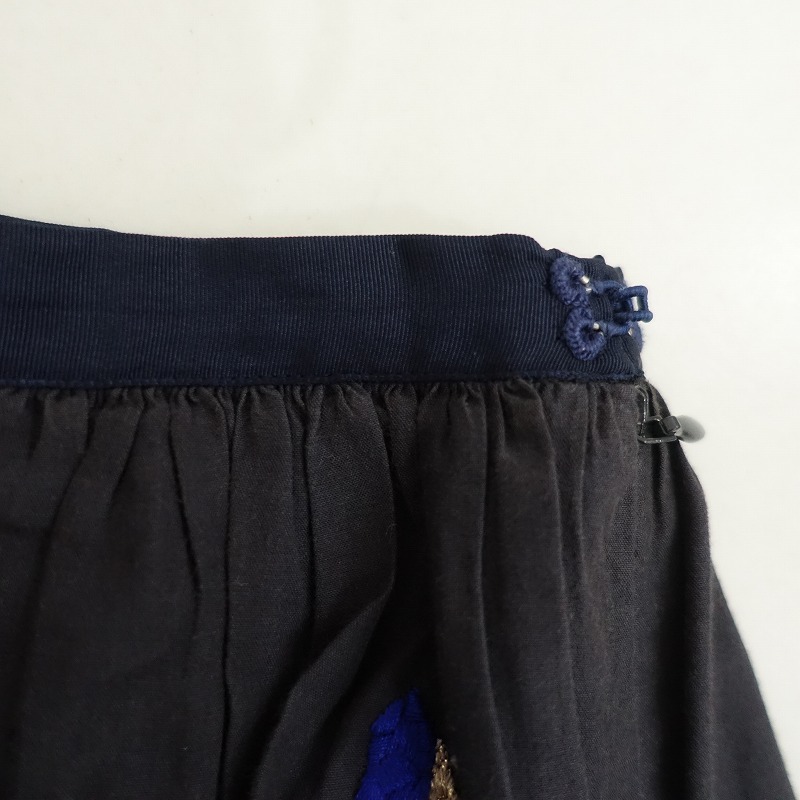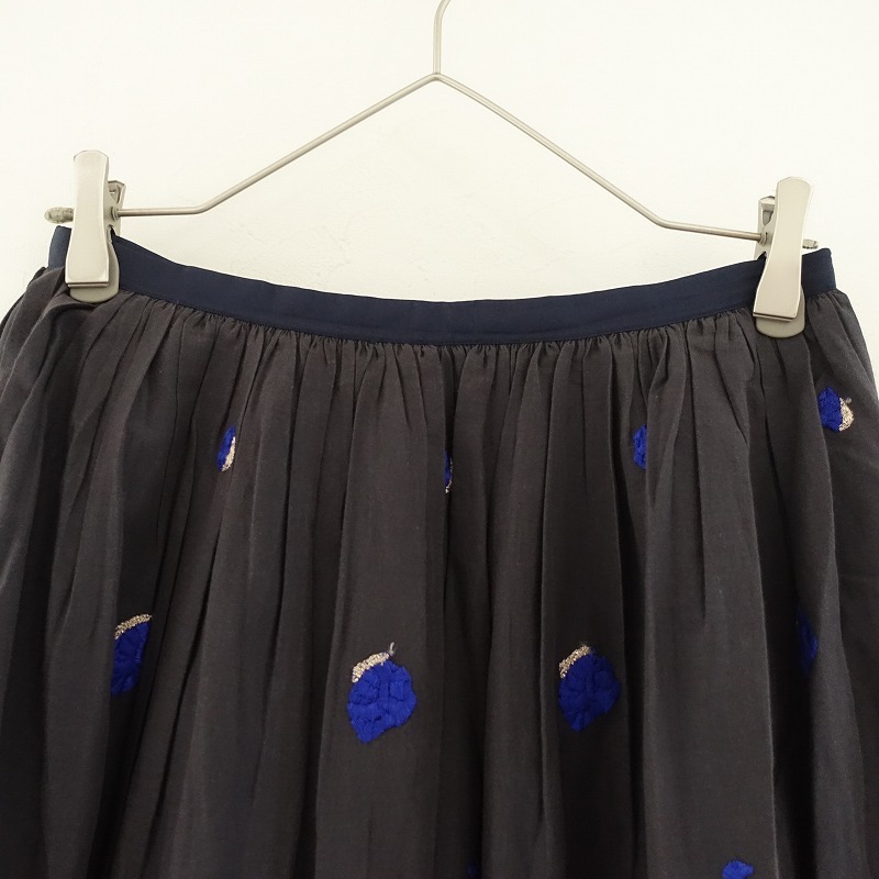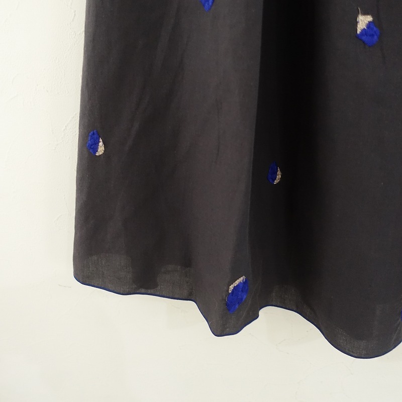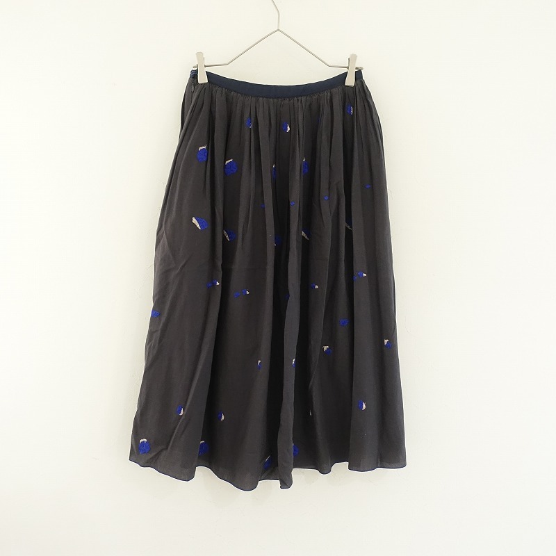 | mina perhonenのpebble刺しゅう入りコットンギャザースカートです。カラーはチャコールで、pebbleのテキスタイル刺しゅうがあしらわれた薄手のコットン地で仕立てられています。左サイドのファスナーで着脱でき、裏地付きです。 |