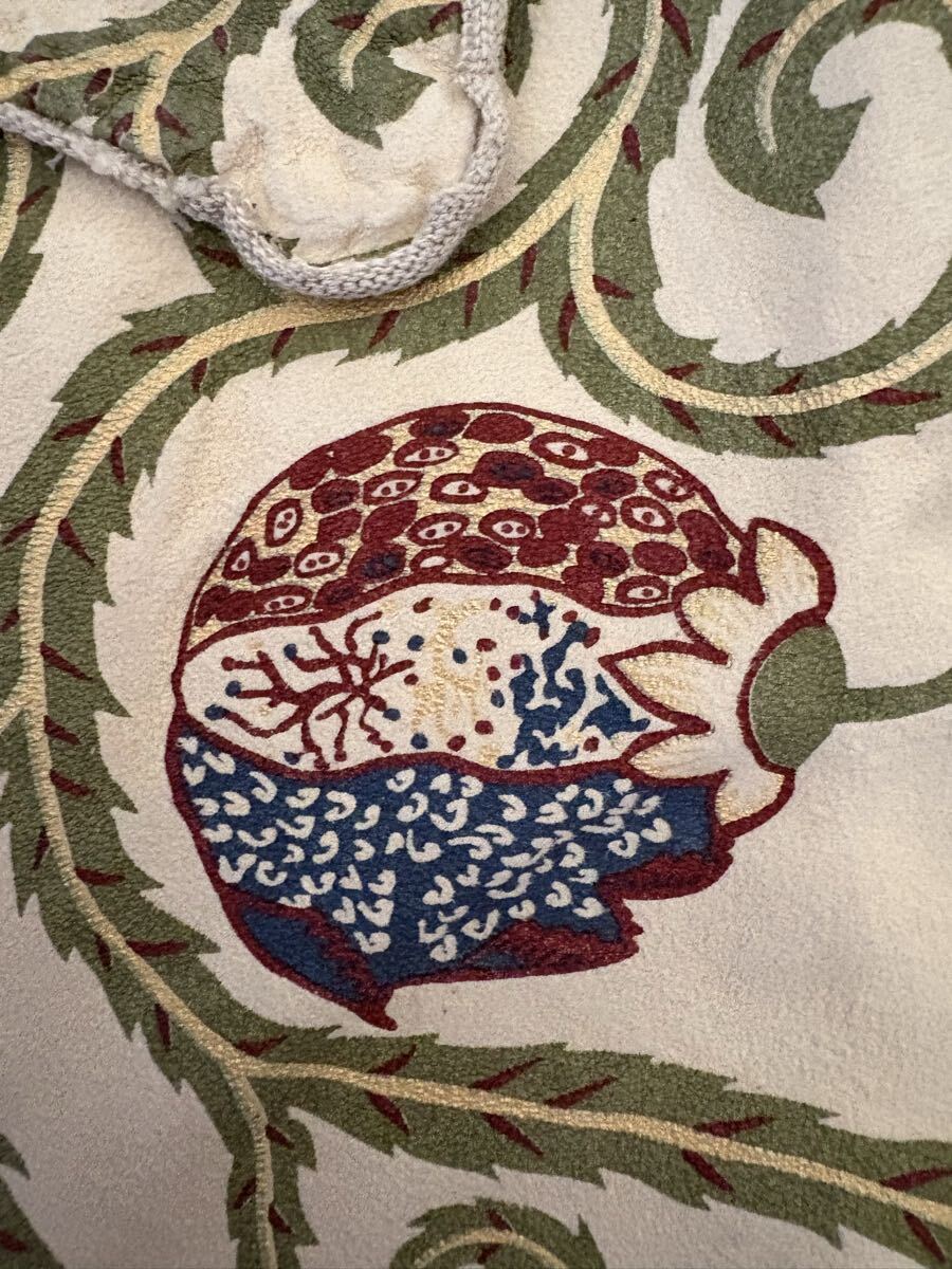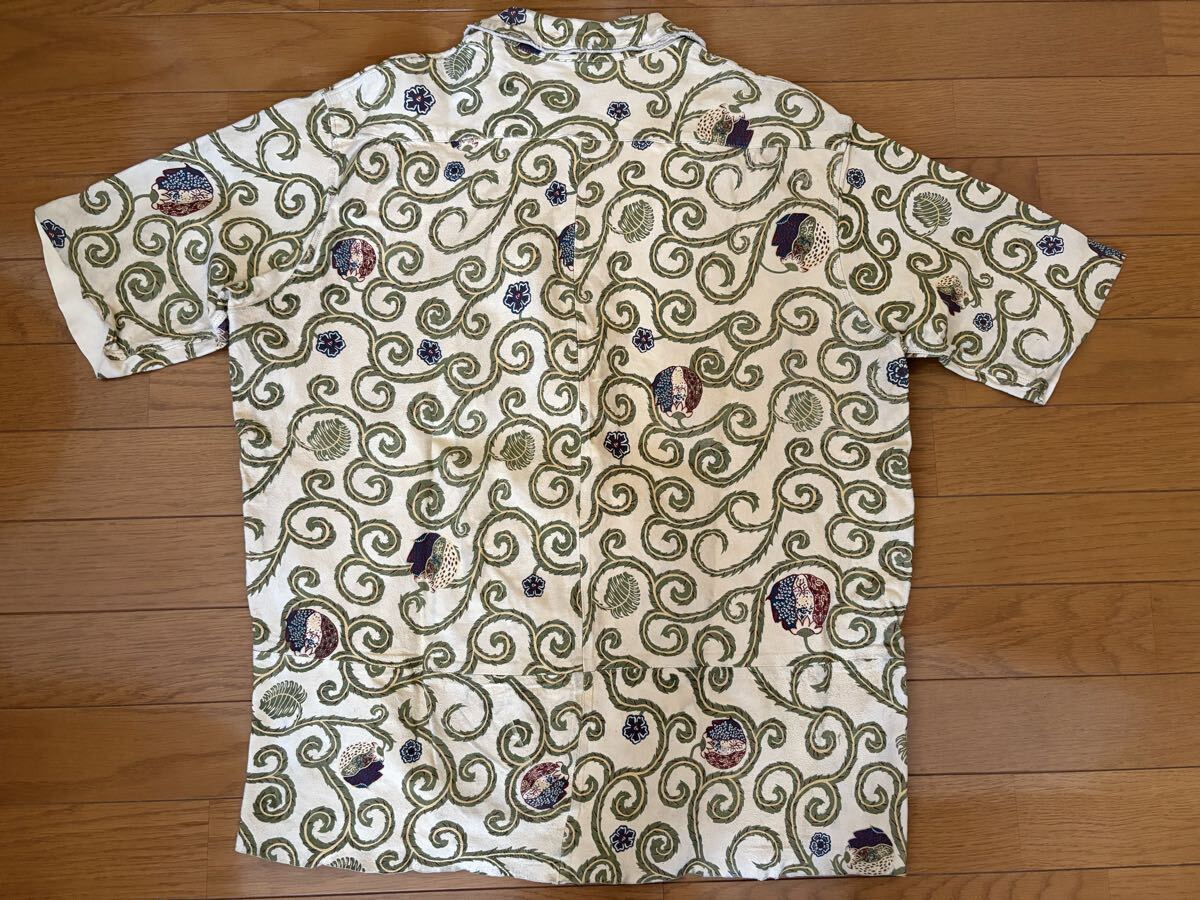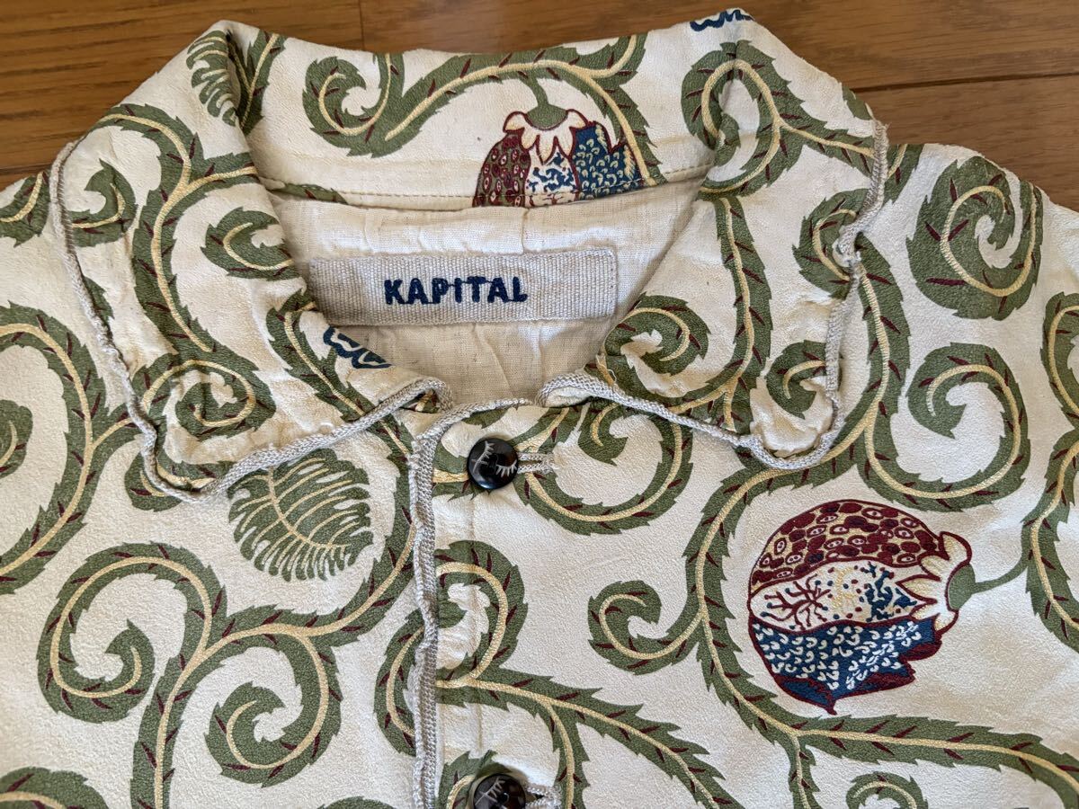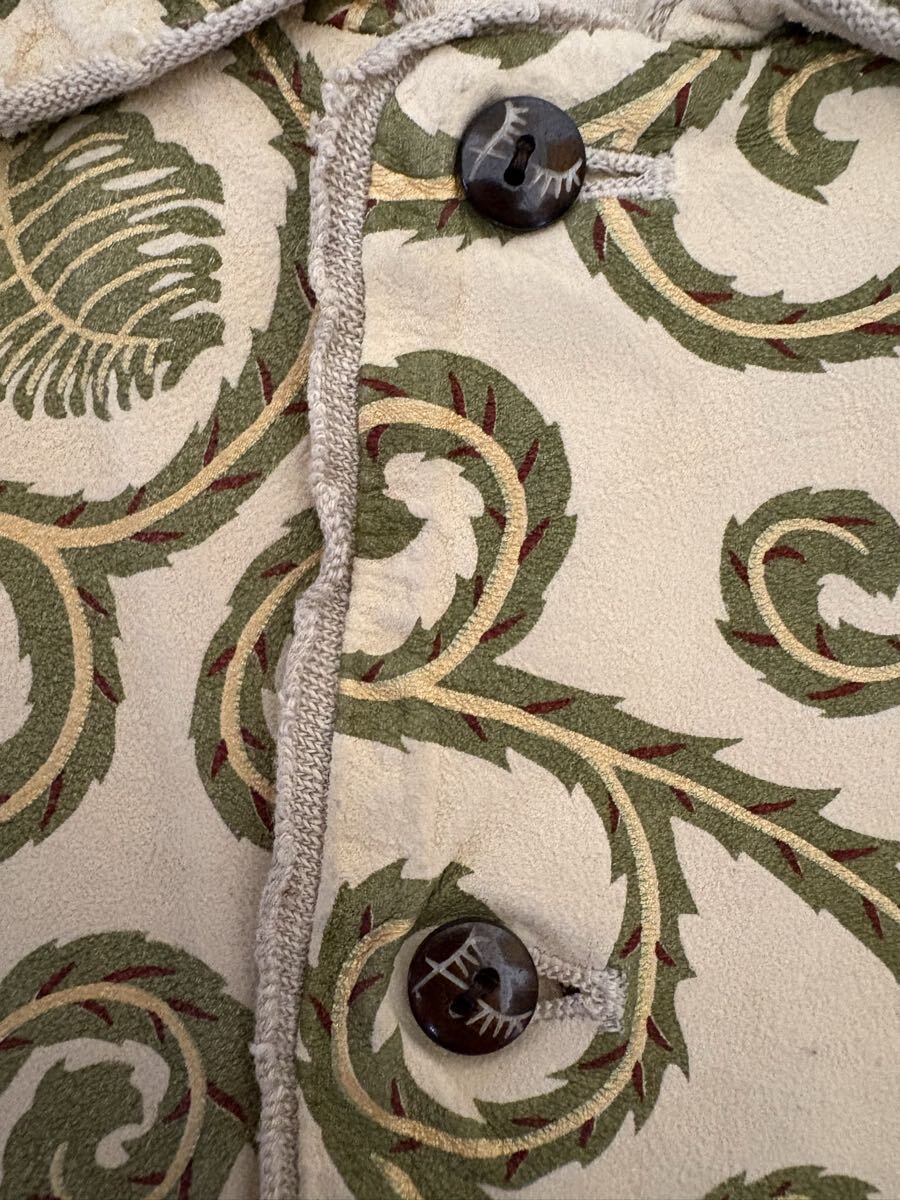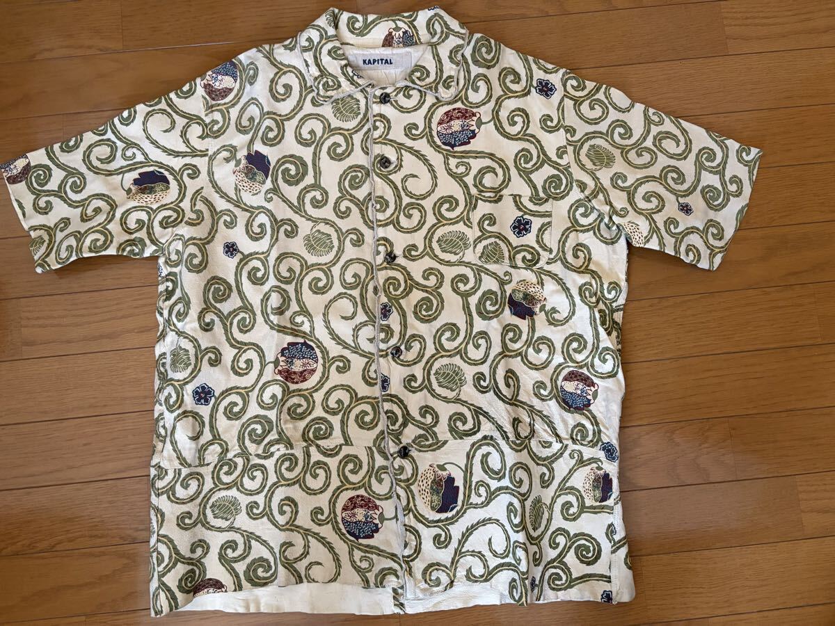 随分古いkapitalの商品で、kapital《キャピタル》の唐草模様柄の山羊革レザー半袖シャツです。サイズL。コレクションとして、保管していましたので、古いですが、美品の方だと思います。実寸は、肩幅約47cm、身幅約60cm、着丈約70cmです。若干の誤差はご了承下さい。今後、このレザーシャツのような商品は出てこないのではないでしょうか?ノークレーム、ノーリターンでお願いします。